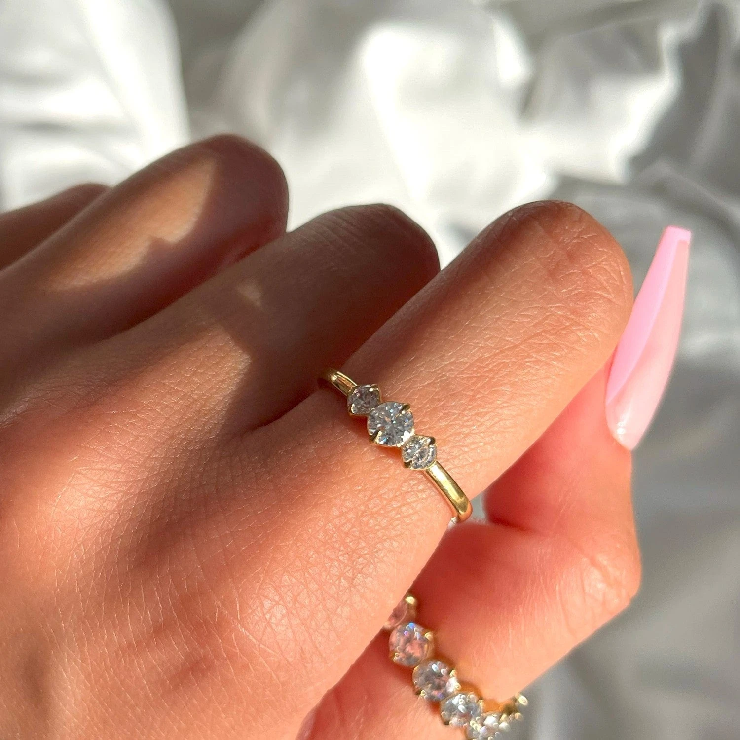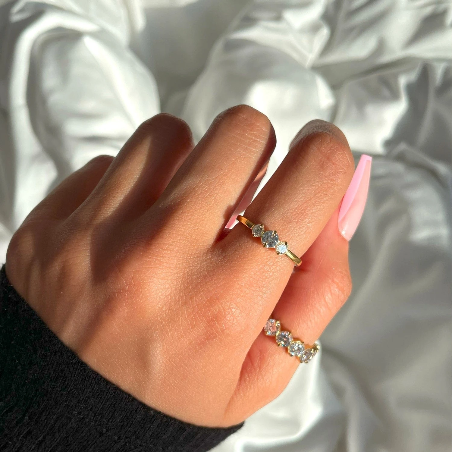 Dieser klassisch-elegante Solitär Ring darf in keiner Schmuck Sammlung fehlen. Er kann perfekt kombiniert werden oder auch alleine getragen werden. Durch die drei funkelnden Steine im Brilliant-Schliff wird das Sonnenlicht besonders gut eingefangen. Der 3 Stones Ring krönt Deine Hand zum Hingucker!