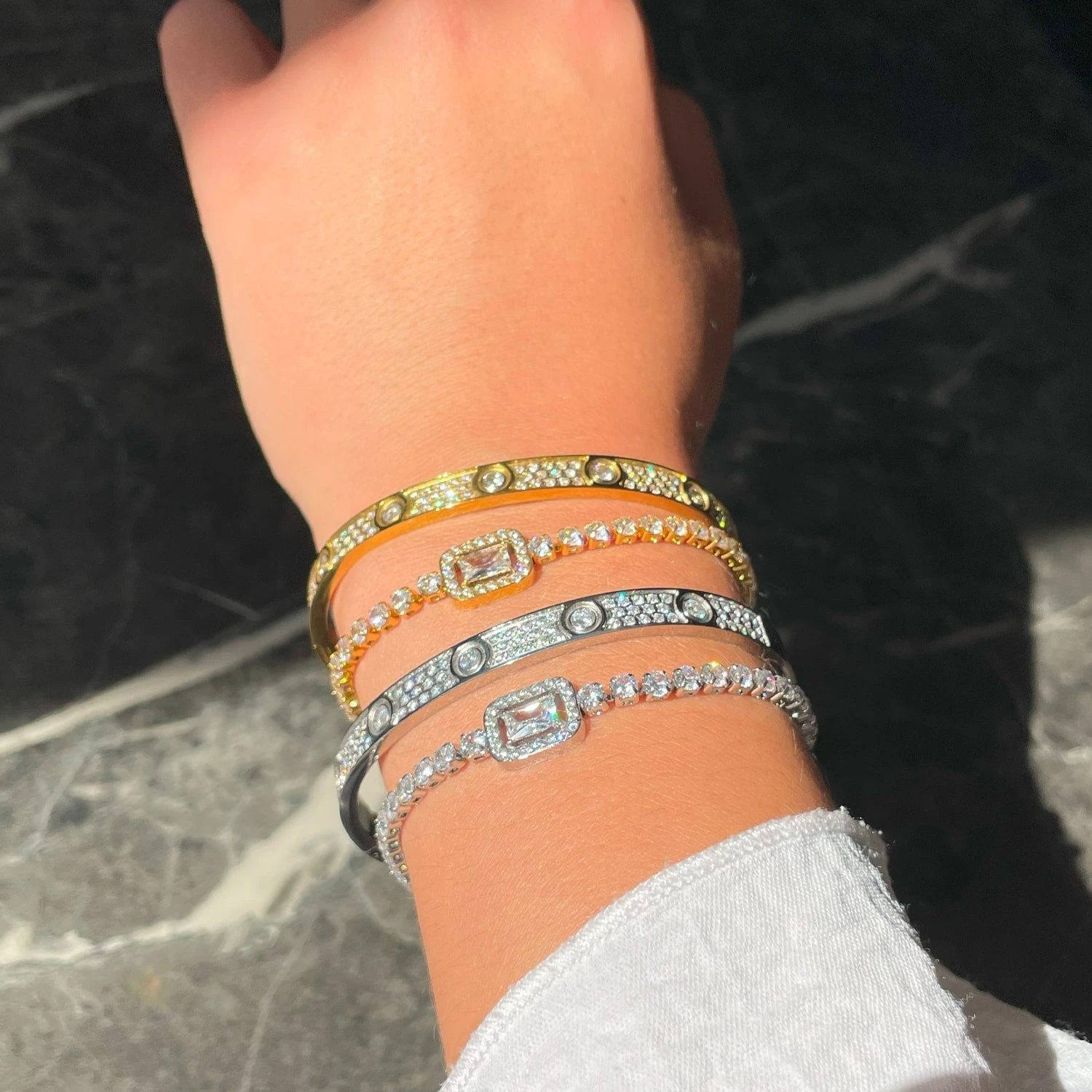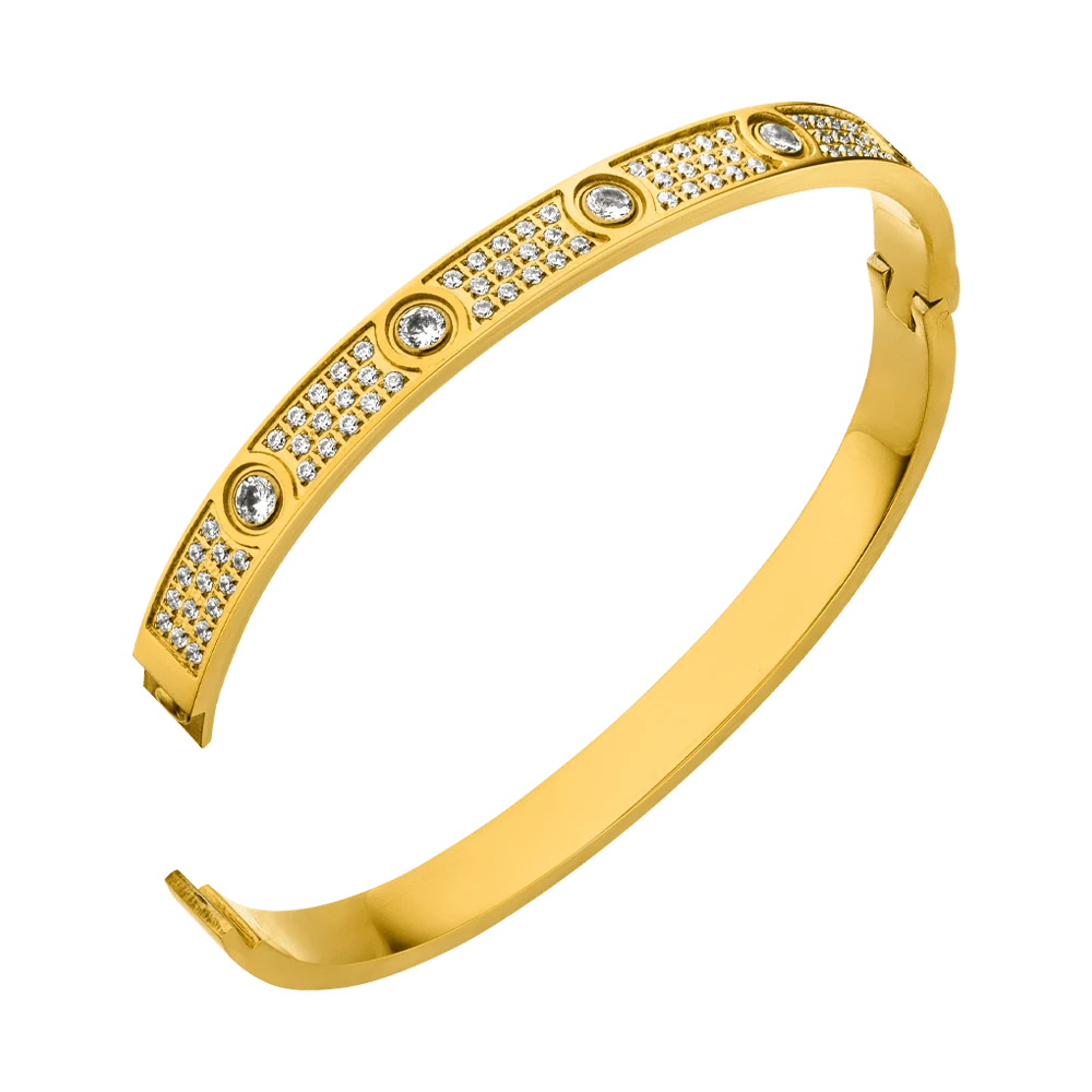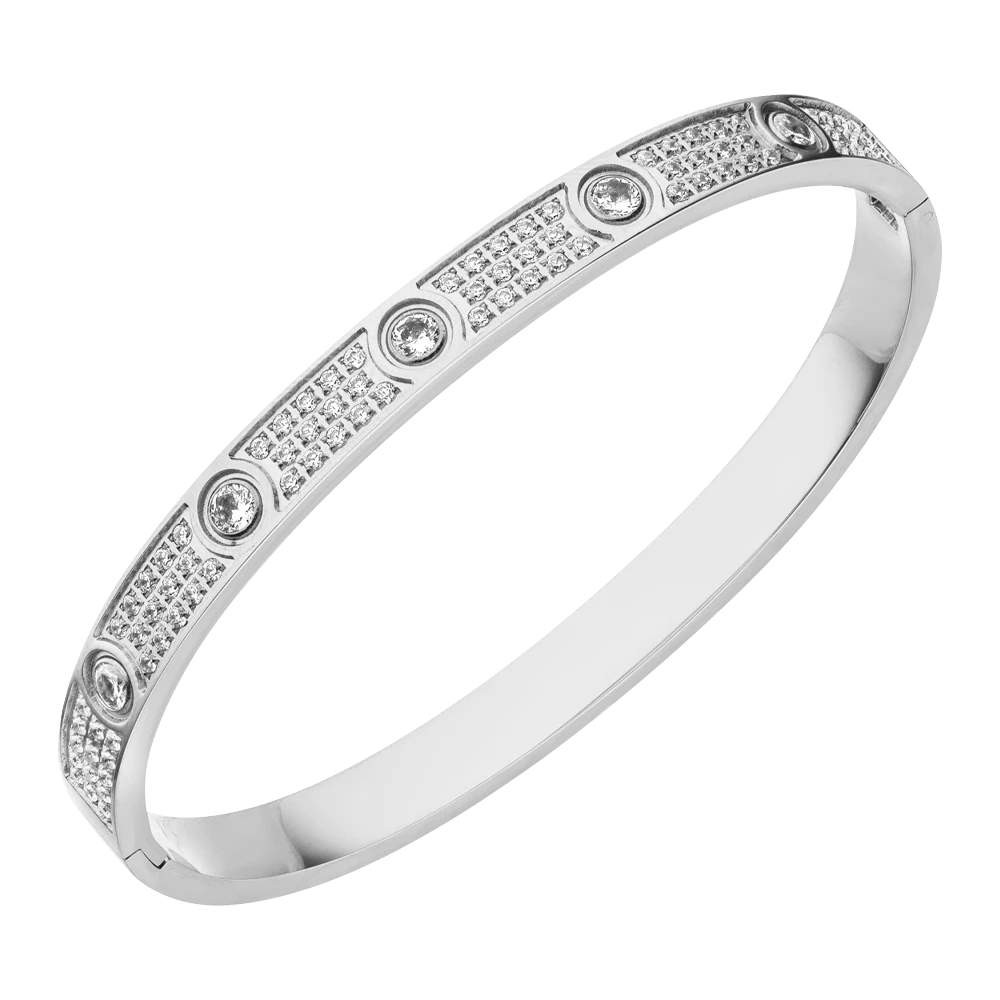 Dieser luxoriöse Armreif ist ein echter Klassiker und darf in keiner Schmuck-Sammlung fehlen. Die zahlreichen funkelnden Steinchen rundum sorgen für einen eindrucksvollen Auftritt. Jeder einzelne Stein ist einzeln eingefasst und lässt dich strahlen.