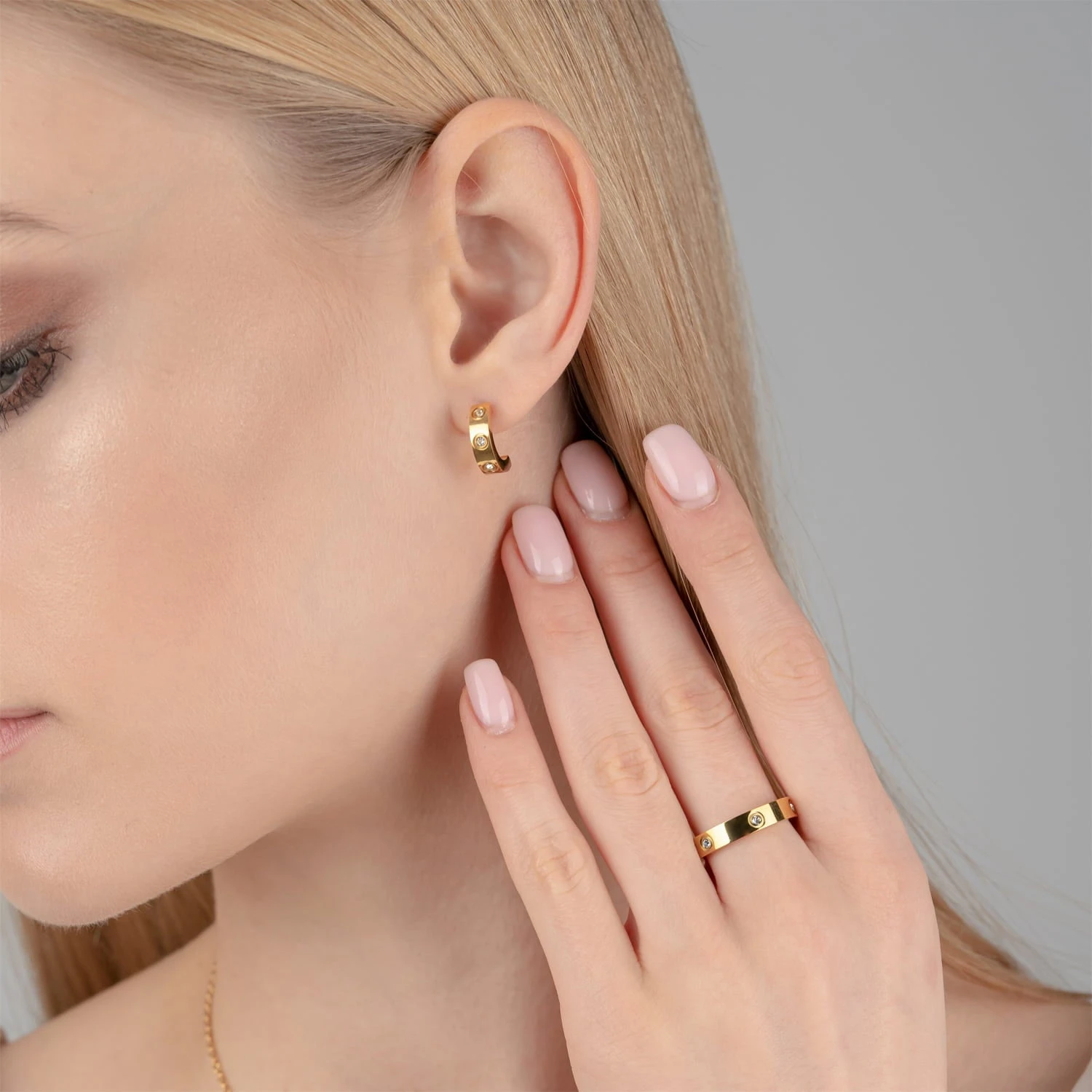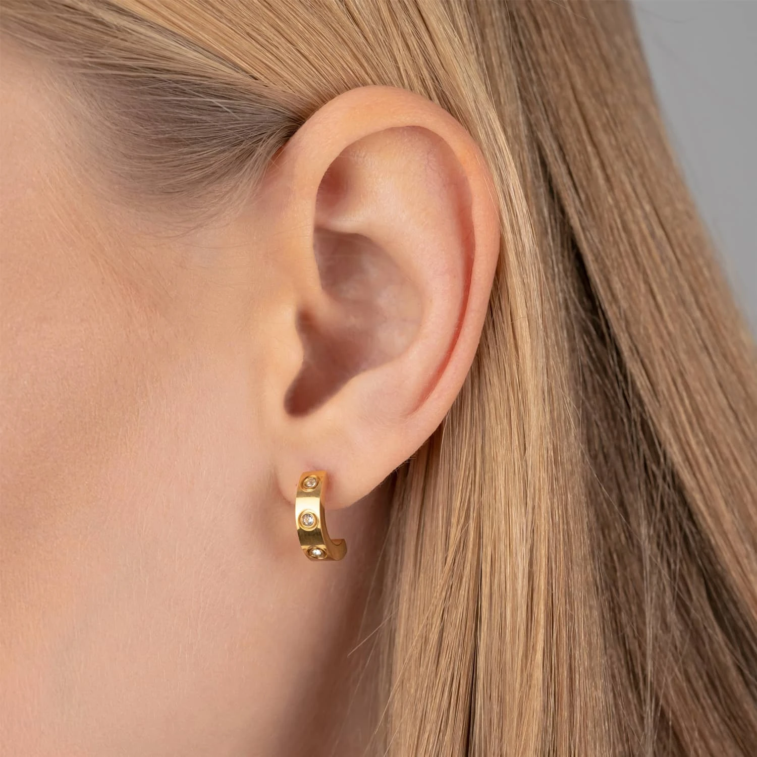 Diese eleganten Ohrringe sind mit funkelnden Zirkonia Steinen besetzt. Um fĂŒr einen besonderen Glanz zu sorgen, werden sie mit 18 Karat Gelbgold vergoldet bzw. Hochglanz poliert. AuĂerdem werden die Arianna Ohrringe aus besonders hautfreundlichem Chirurgenstahl gefertigt, sodass sie nicht nur wasserfest sind und nicht verfĂ€rben, sondern auch perfekt fĂŒr den Alltag geeignet sind.