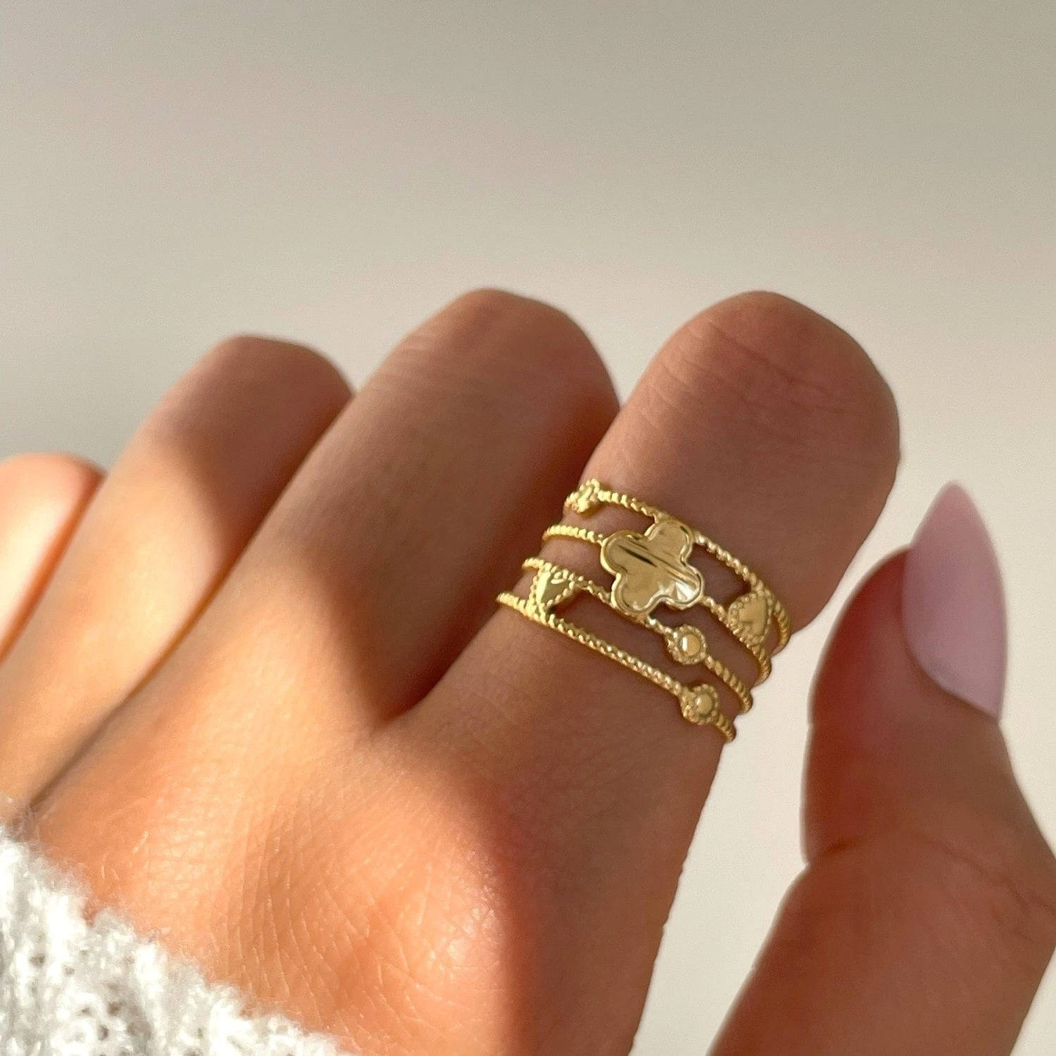 Unser kunstvoller Art Clover Ring ist wasserfest und größenverstellbar (Gr. S-XL). Zusammen mit unseren anderen Clover Schmuckstücken entsteht ein runder Look.