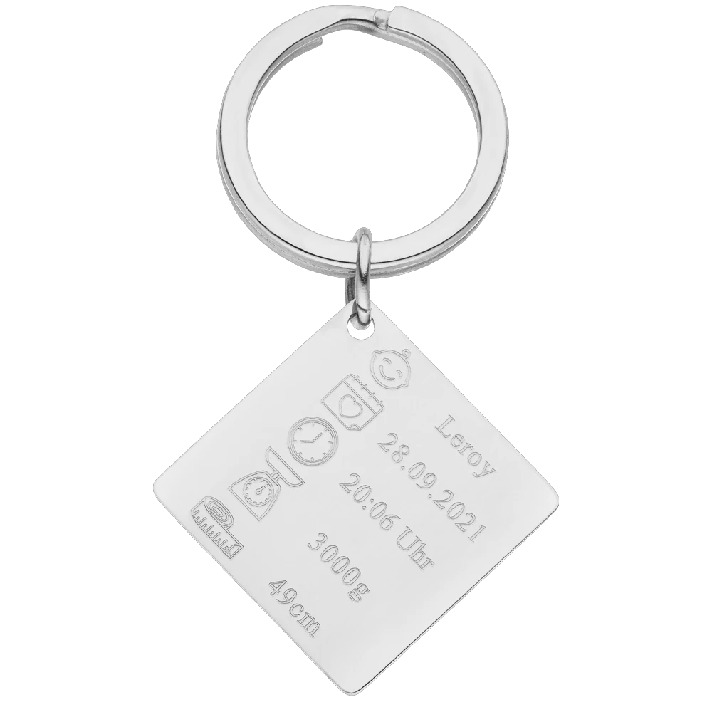Personalisiere Deinen Schlüsselanhänger individuell mit einer Gravur der Geburtsdaten und erschaffe so ein persönliches Unikat nur für Dich allein oder als Geschenk für eine besondere Person! Wähle den Wunsch Namen, das Geburtsjahr, die Geburtsuhrzeit, das Geburtsgewicht und die Körpergröße.