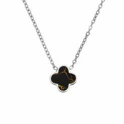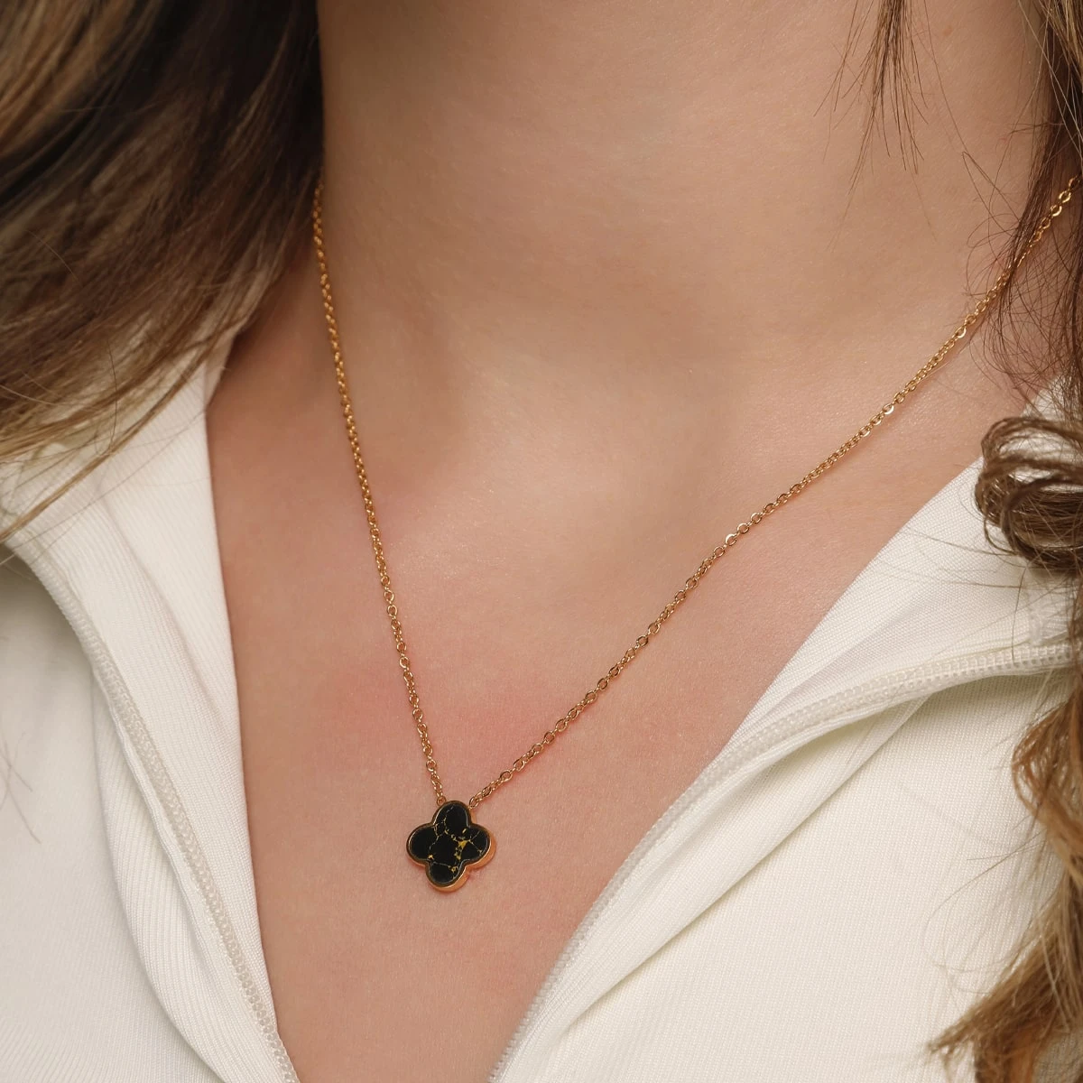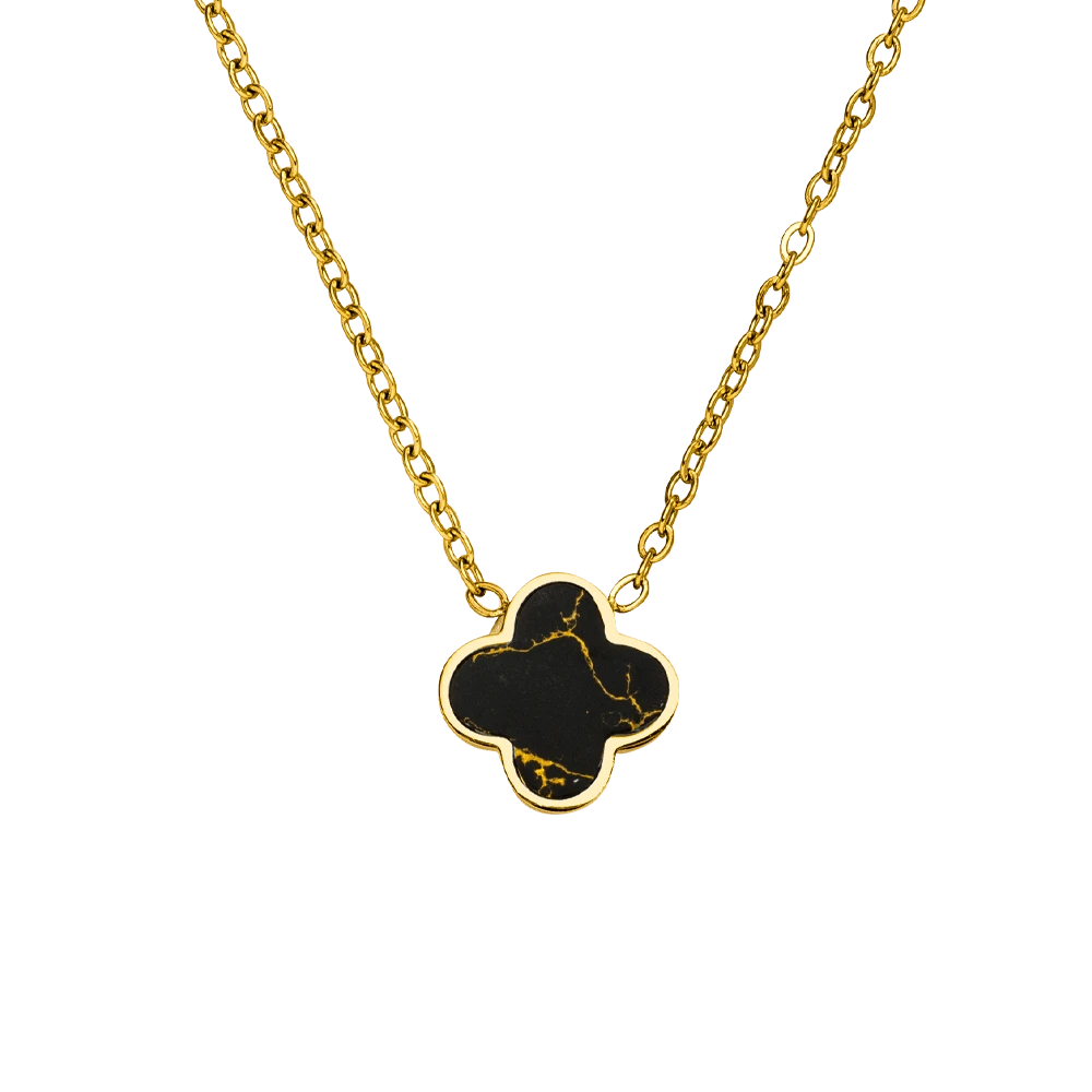 Unsere Black-Gold Clover Halskette ist mit einem Kleeblatt gefüllt mit einem Naturstein mit gold-schwarzer Marmorierung. Diese schöne Kleeblättchen Halskette für den Alltag, sorgt für ein elegantes Auftreten. Die Oberfläche glänzt dank der 18K Vergoldung bzw. der Hochglanz-Veredelung. Jedes Kleeblatt ist dank der Marmorierung ein Unikat.