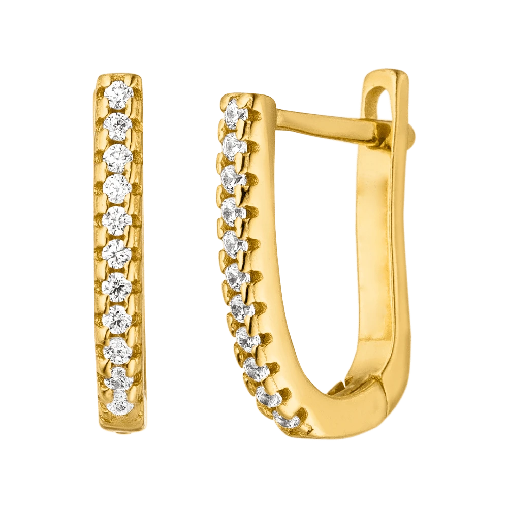 Hochwertige wasserfeste Ohrringe besetzt mit funkelnden Zirkonia-Steinen. Unsere „U-förmigen“ Bonita Huggies bilden die geschmeidige Form der Harfe nach. Sie schmiegen sich Deinen Ohren an und sind eine wahre Symphonie!