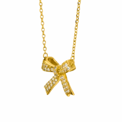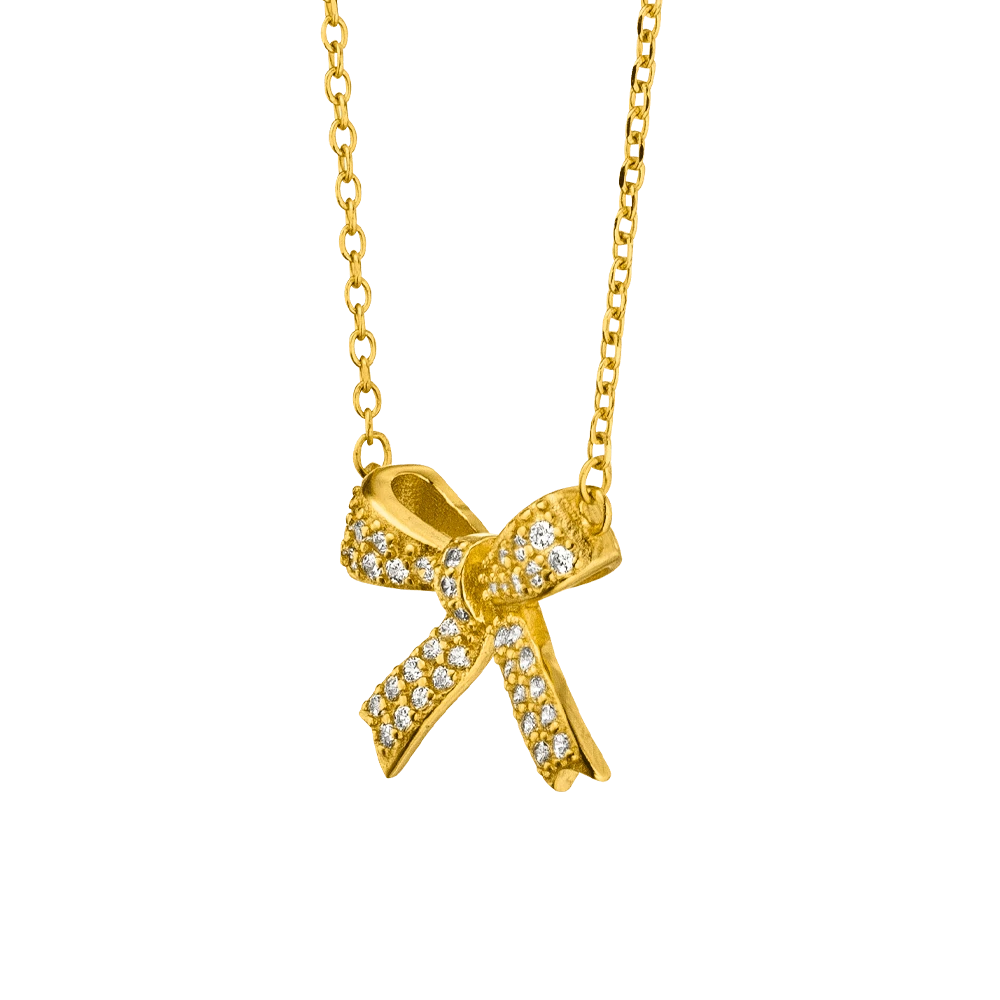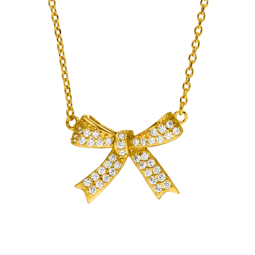 Diese elegante Halskette aus hochwertigem 925er Silber ist wahlweise in 18K Gelbgold vergoldet oder rhodiniert für einen langlebigen Glanz erhältlich. Der bezaubernde Anhänger in Form einer Schleife ist mit feinen Zirkonia-Steinen besetzt und verleiht jedem Look einen Hauch von Glamour. Ein stilvolles Accessoire, das zart und zugleich wirkungsvoll ist – perfekt für besondere Anlässe oder den Alltag.