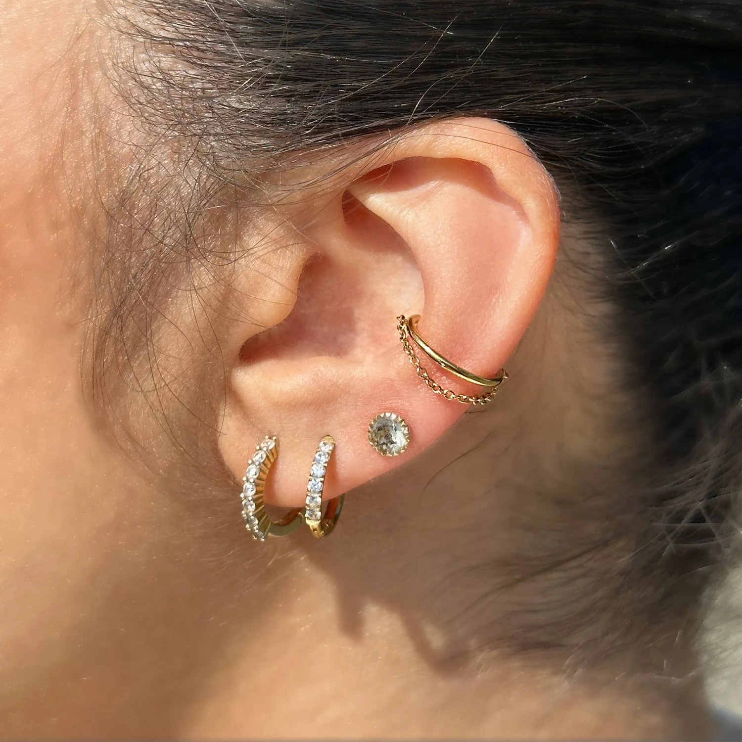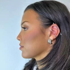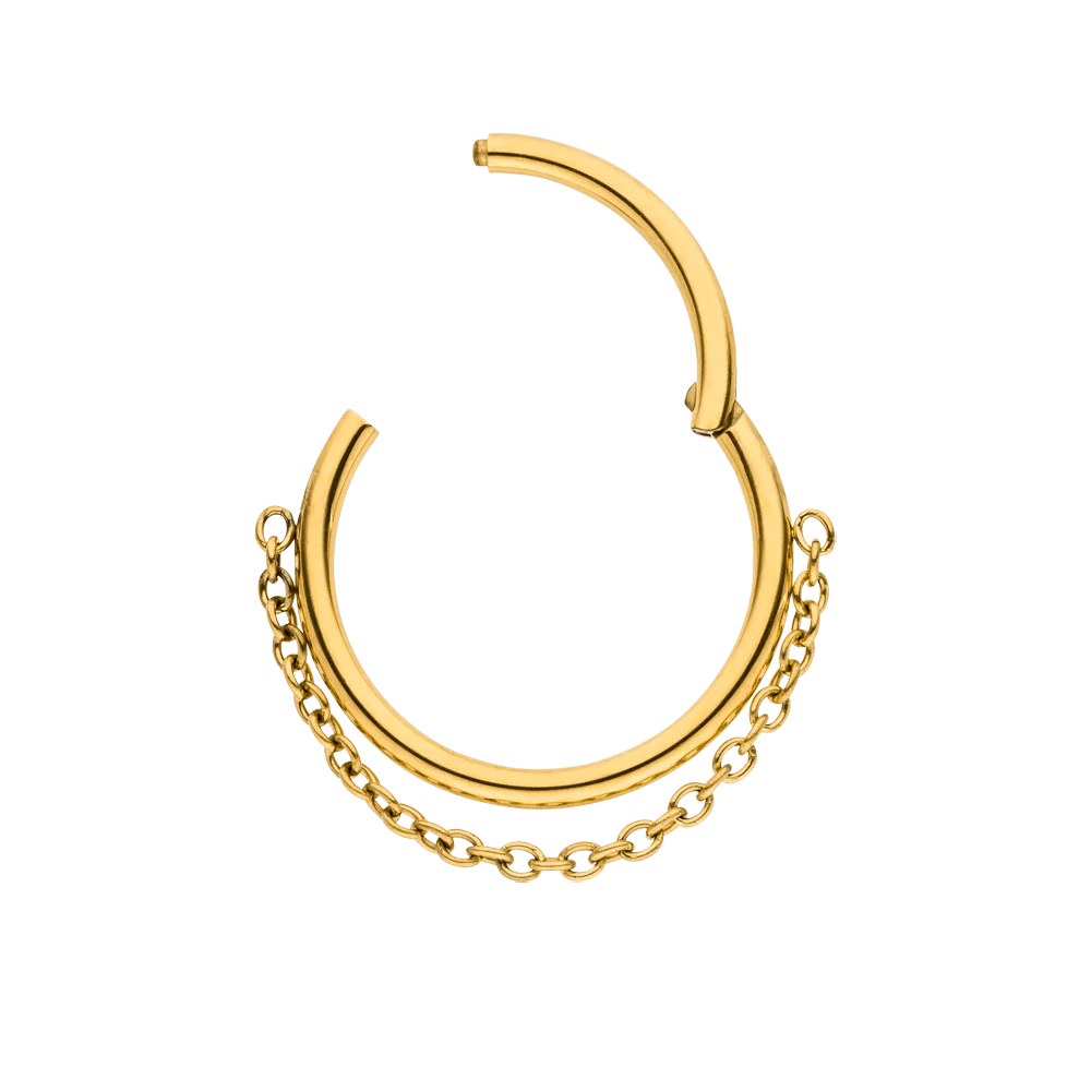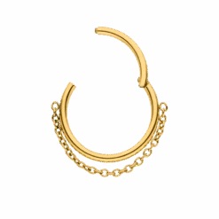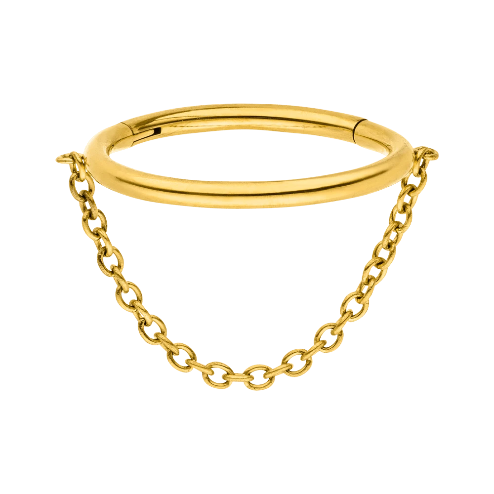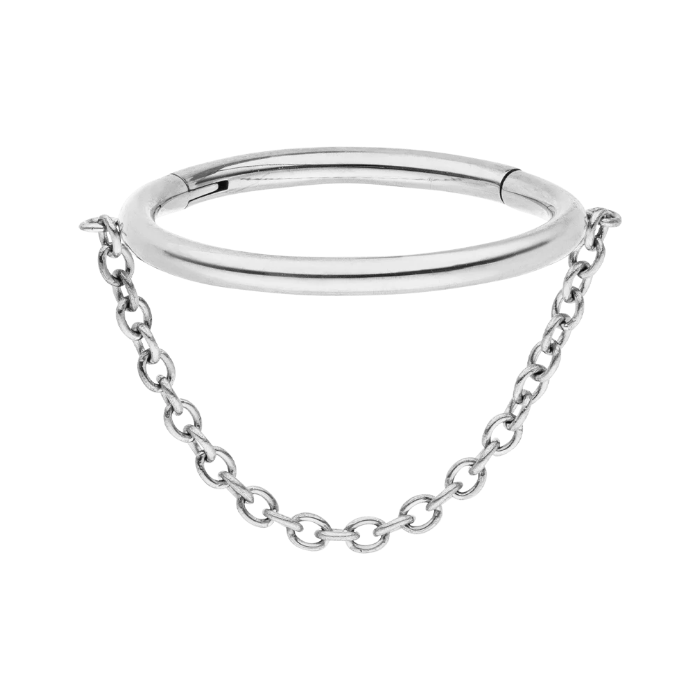 Hochwertiger Segmentring mit Clickerverschluss und stylischer Kette aus medizinischem Titan. Unser Chain Clicker Piercing kann als Conch (12mm) oder als Helix (7mm) getragen werden. Außerdem ist es bestens als Ersteinsatz geeignet, da es aus Titan höchster Reinheit besteht. Mit diesem süßen Piercing setzt Du einen dezenten Akzent an Deinem Ohr-Look!