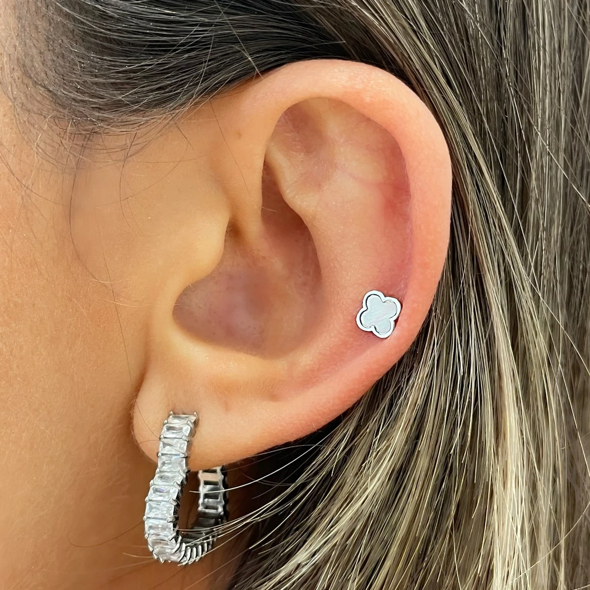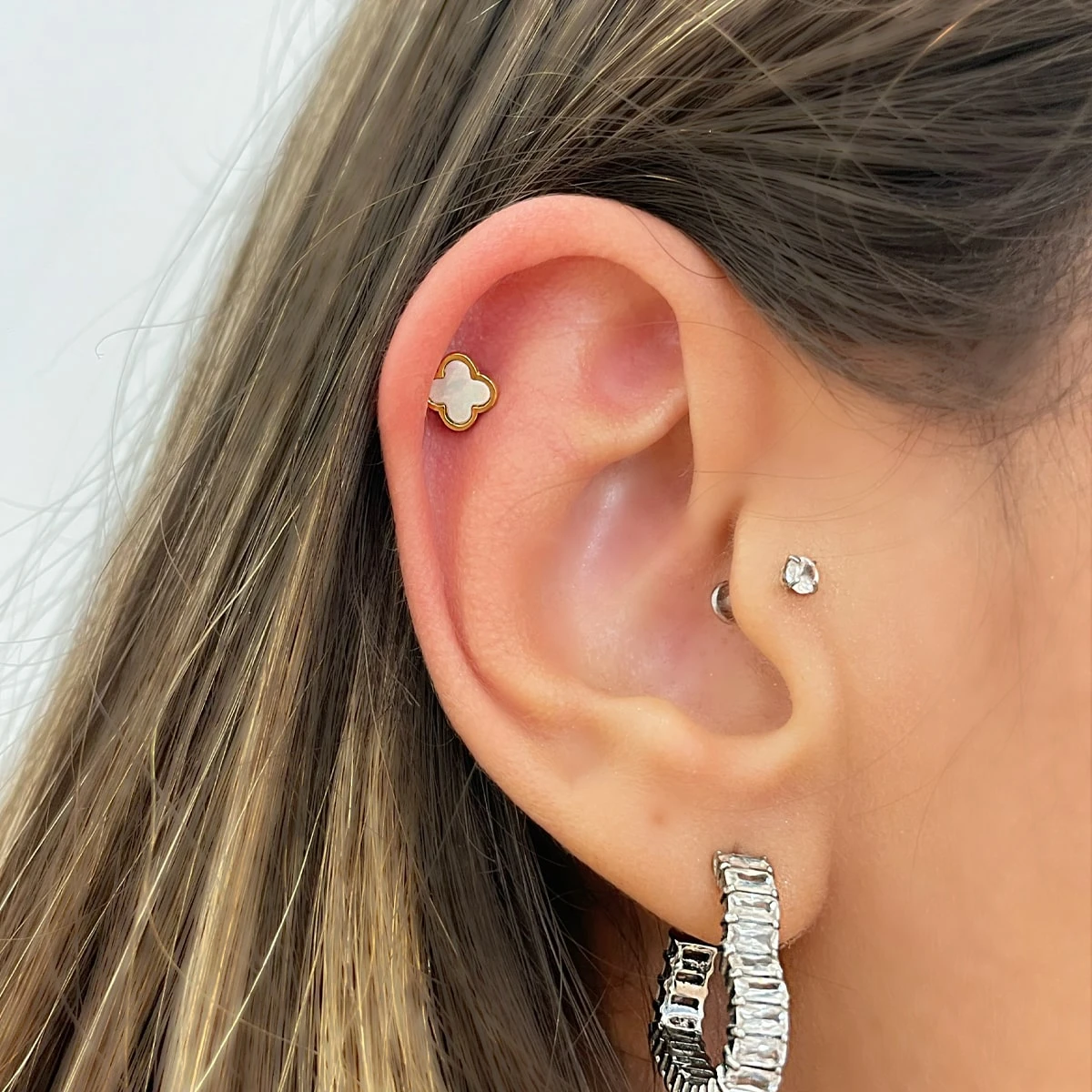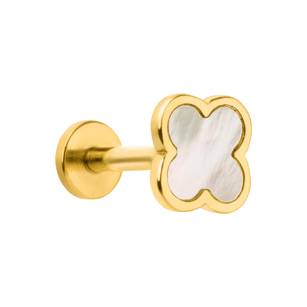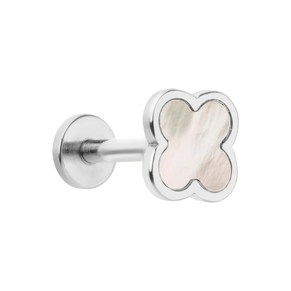 Clover Perlmutt Ohrpiercing mit einer hübschen Kleeblatt-Front mit Perlmutt.