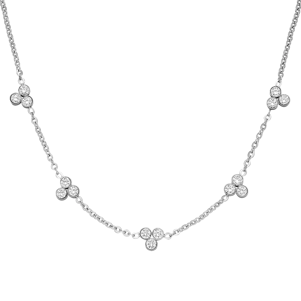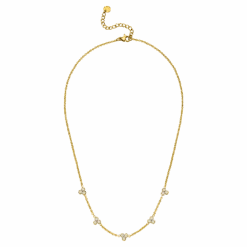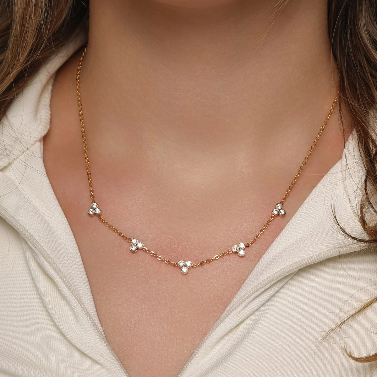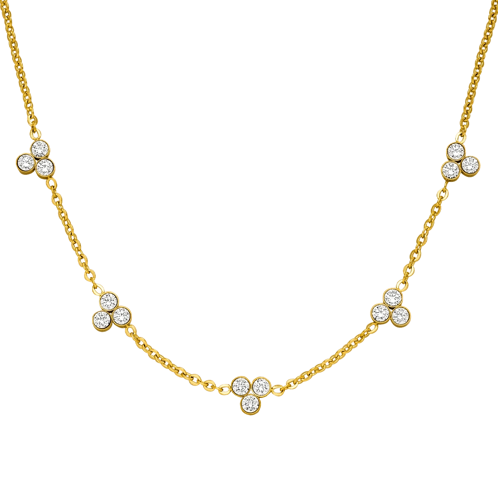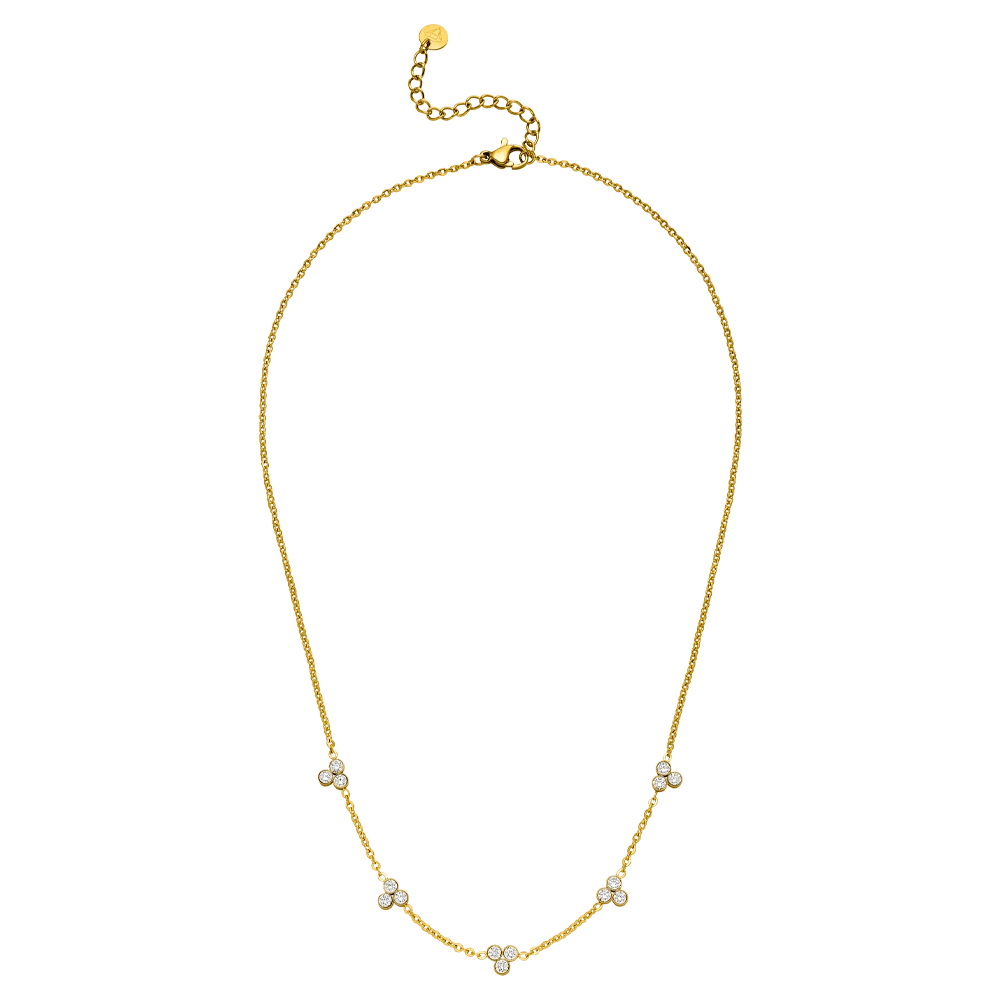 Diese wundervolle Cute Three Kette ist mit 15 hĂŒbschen Zirkonia Steinen im trendigen Brillantschliff bestĂŒckt. Die Halskette wird aus besonders hautfreundlichem Edelstahl gefertigt und mit 18 Karat Gelbgold vergoldet bzw. Hochglanz poliert. Sie ist wasserfest und bestĂ€ndig, also der perfekte Alltags-Begleiter.