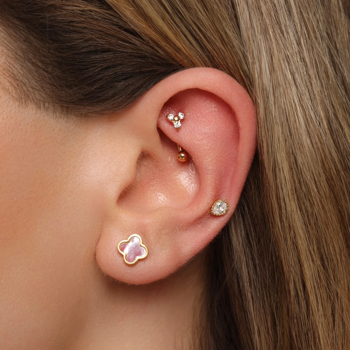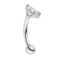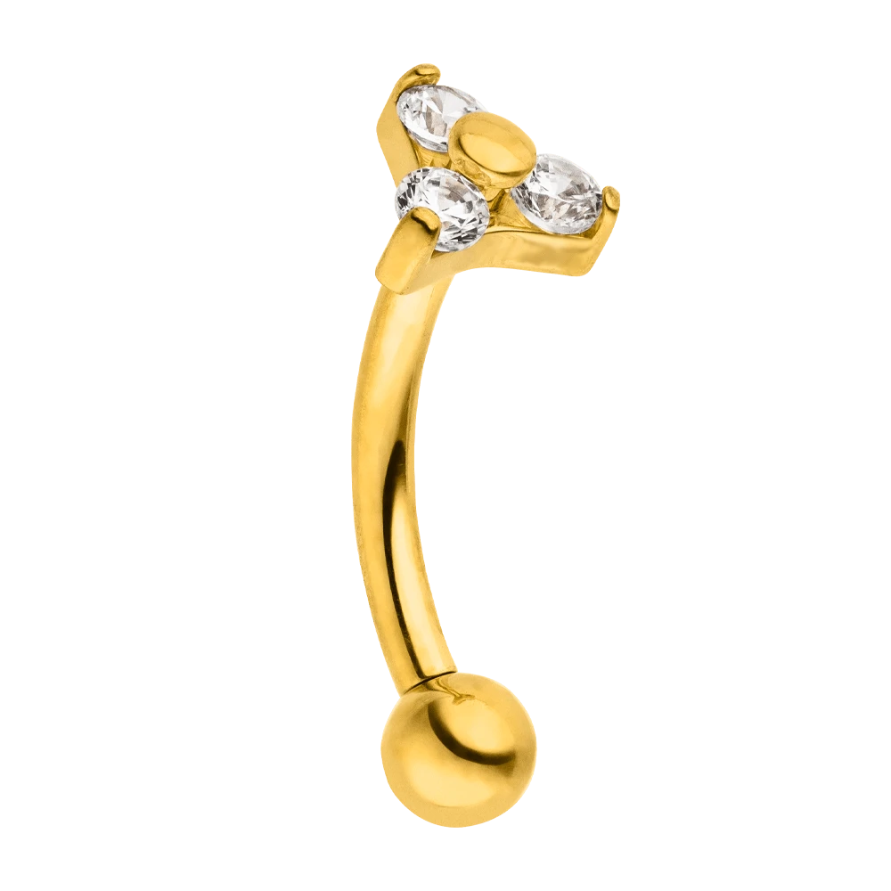 Dieses Cute Three Piercing ist mit drei eingefassten Zirkonia-Stein bestückt. Es wird aus beständigem und hautfreundlichem Titan gefertigt und mit 18K Gelbgold vergoldet bzw. Hochglanz poliert.