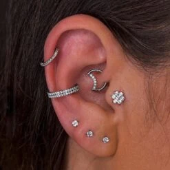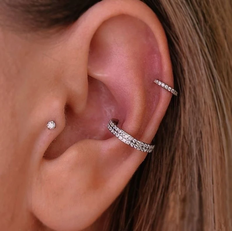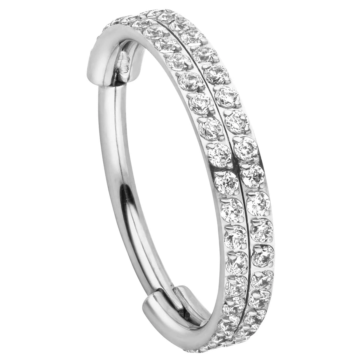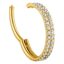 Hochwertiger Segmentring mit Clickerverschluss aus antiallergischem Titan mit 18 Karat Vergoldung. Mit seinen funkelnden Glitzer-Steinen sorgt unser Double Conch Clicker Piercing für einen glänzenden Auftritt. Dieses wasserfeste Titan Piercing eignet sich besonders gut für Allergiker und für den Ersteinsatz.