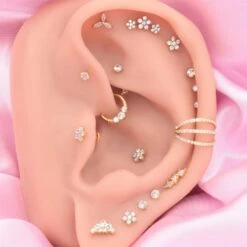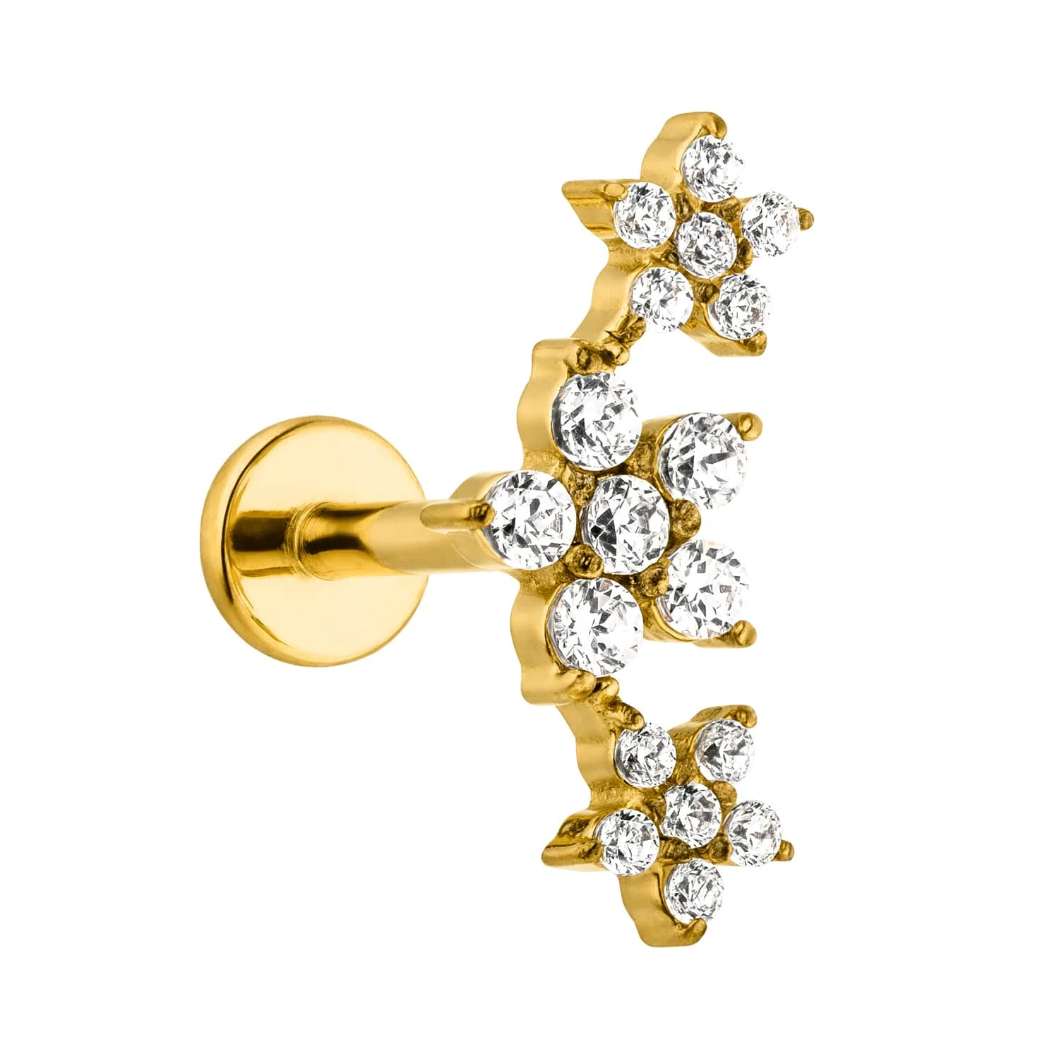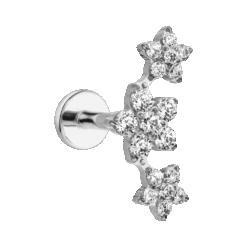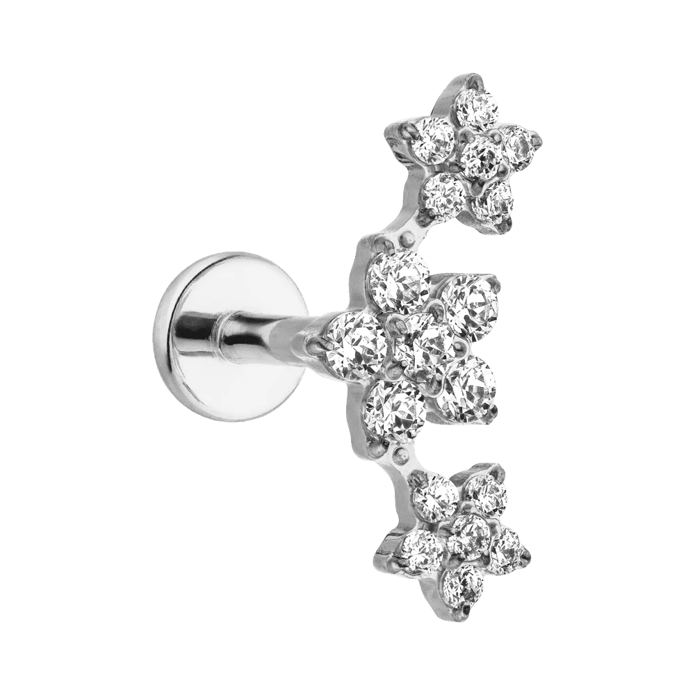 Das wunderschöne Flowerish Ohrpiercing in Form von drei Blüten ist mit funkelnden Zirkonia-Steinen in Form von Blumen bestückt. Dieses Labret Piercing wird aus besonders hautverträglichem Titan gefertigt und eignet sich hervorragend zur Kombination mit Ohrringen zu einem eleganten Look.