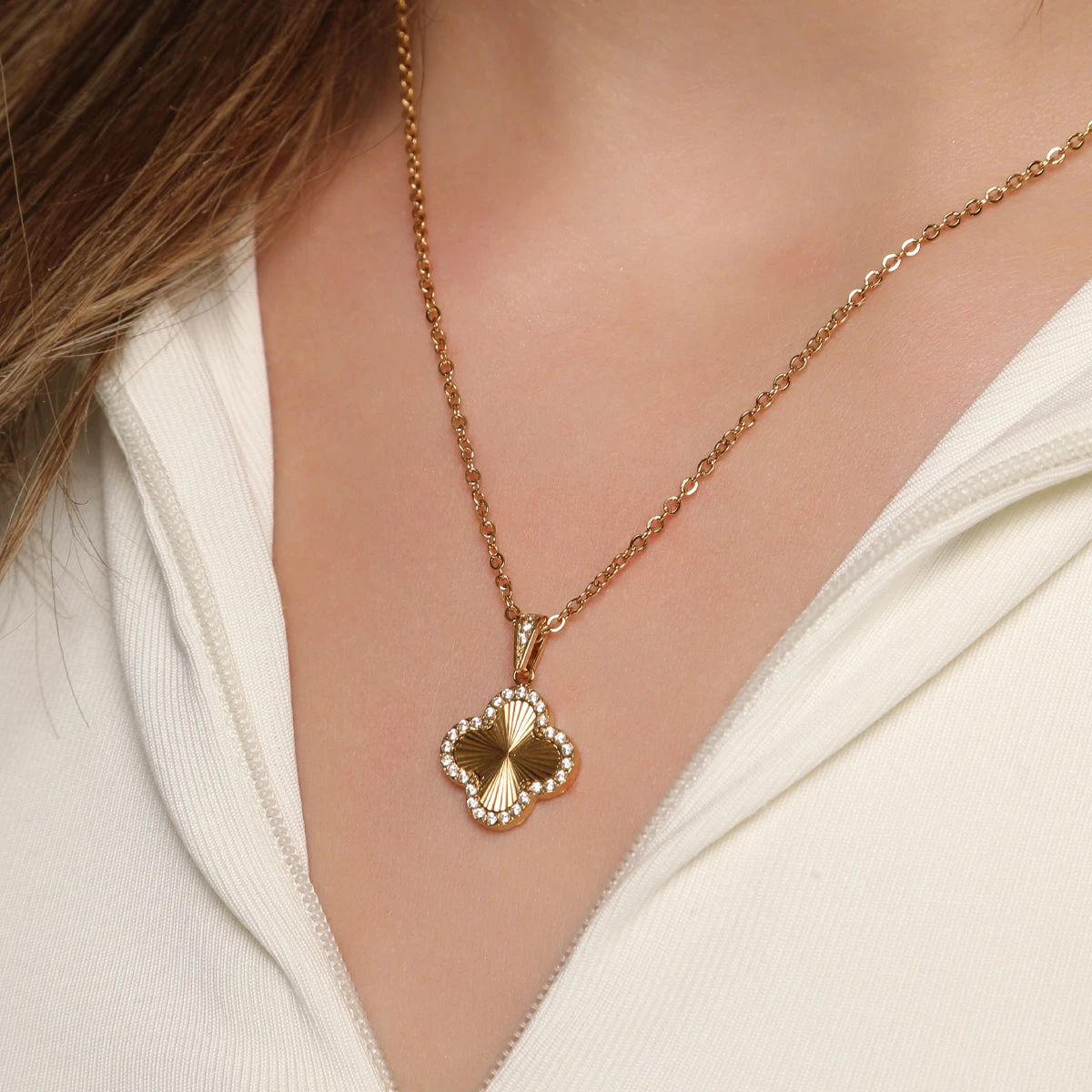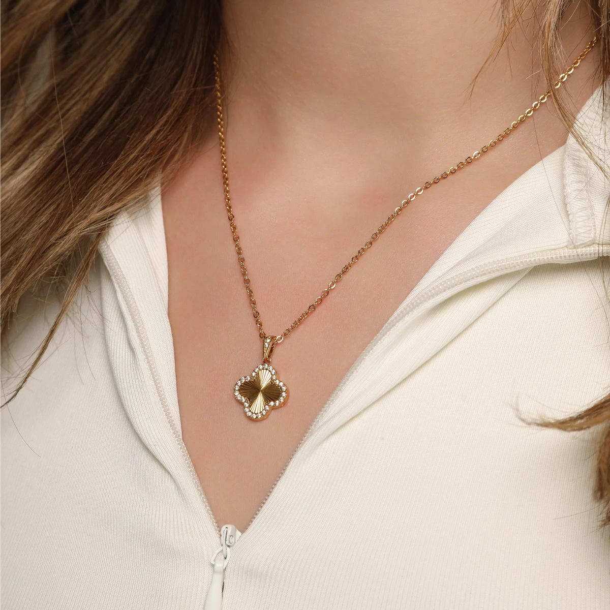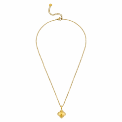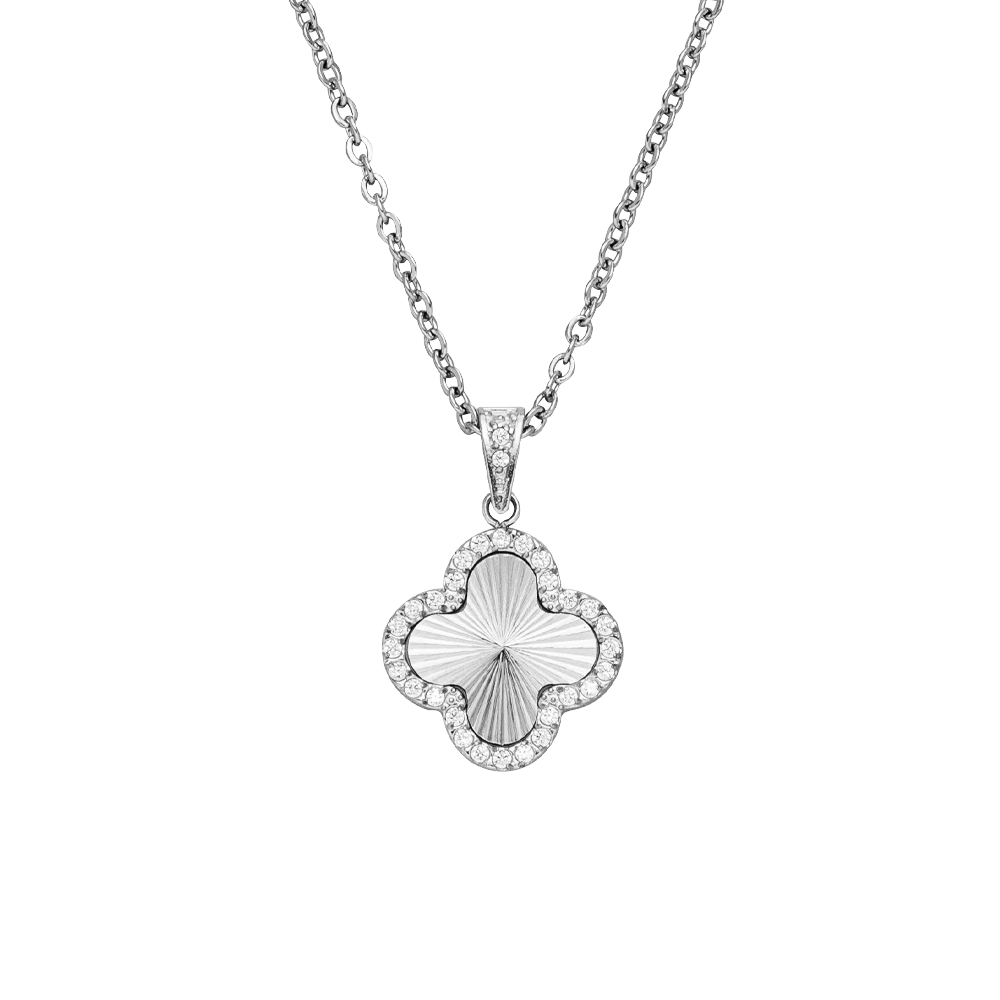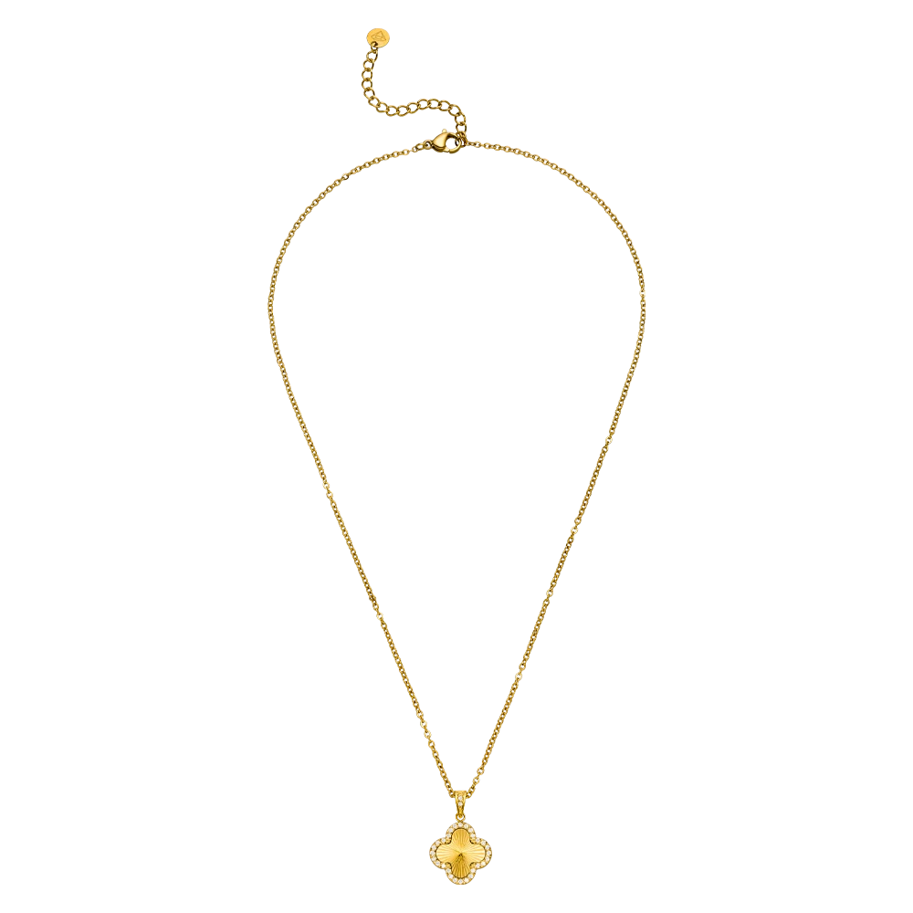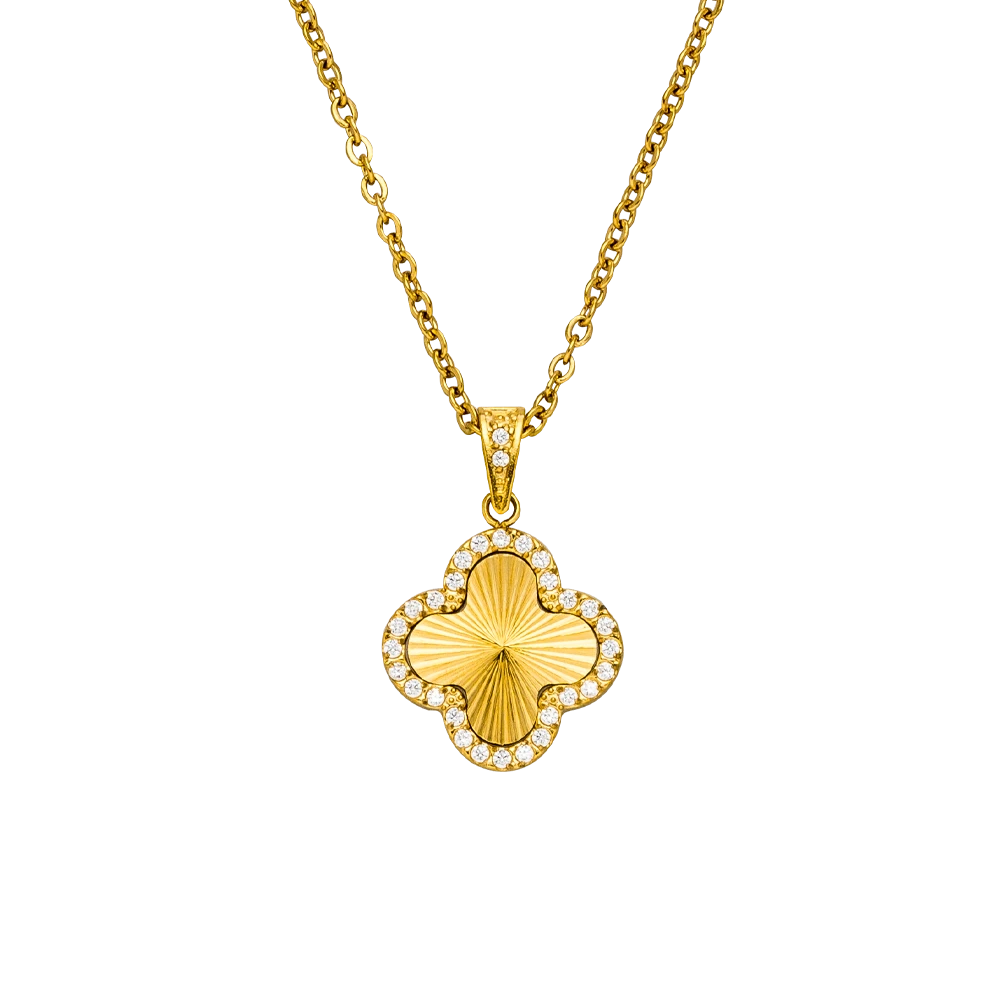 Mit der Glamour Clover Halskette bringst Du Eleganz und zeitlosen Stil perfekt in Einklang. Der goldene Anhänger in stilisierter Kleeblattform ist von funkelnden Zirkonia-Steinen umrahmt und verleiht jedem Look eine luxuriöse Note. Die feine Gliederkette ergänzt das Design harmonisch und sorgt für ein angenehmes Tragegefühl.