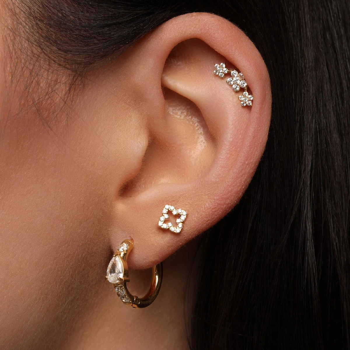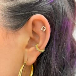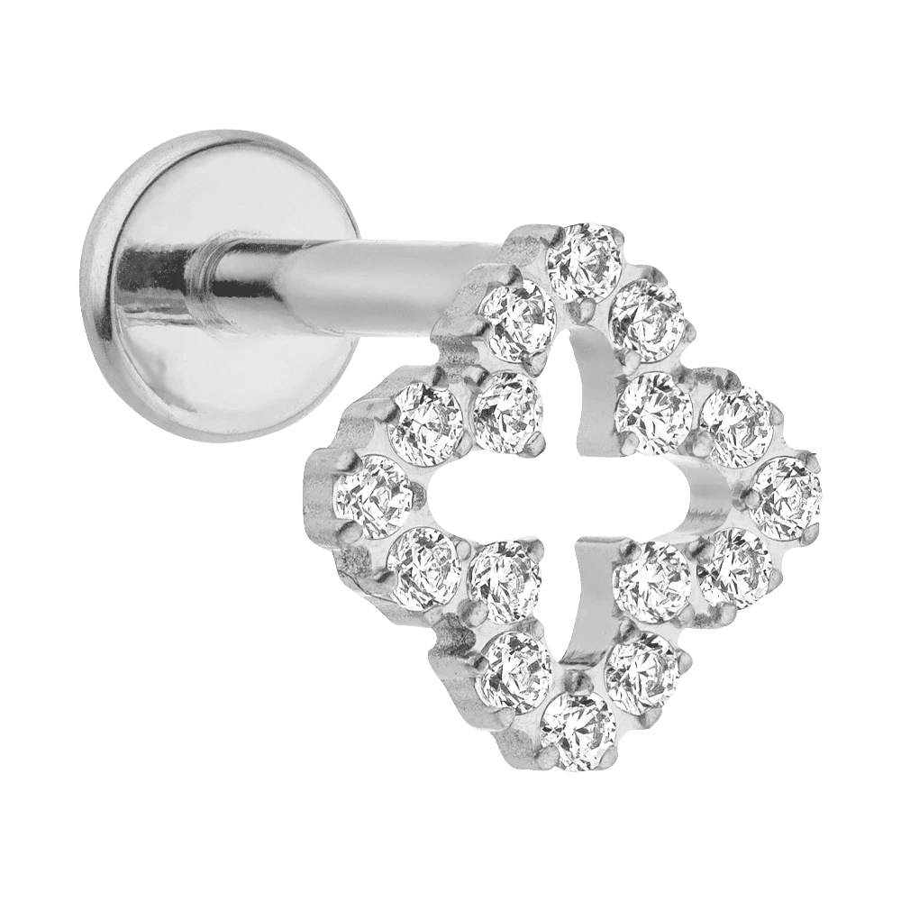 Glim Clover Ohrpiercing mit einer hĂŒbschen Kleeblatt-Front mit funkelnden Zirkonia-Steine.