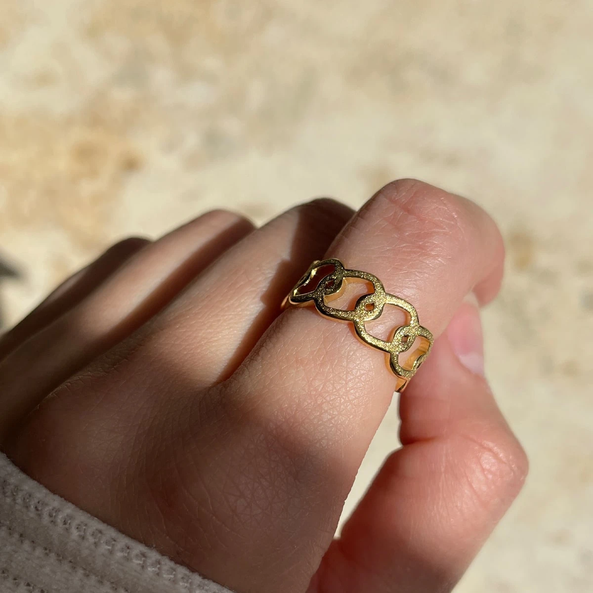 Der Gorgeous Ring überzeugt mit einem offenen Design und einer besonderen Oberfläche, die aussieht, als wären feine Steinchen eingefasst. Die Kombination aus glänzenden und matt strukturierten Elementen macht ihn zu einem echten Hingucker. Gefertigt aus hochwertigem, 18K vergoldetem bzw. Hochglänzendem Edelstahl ist er wasserfest, farbecht und ideal für den Alltag.