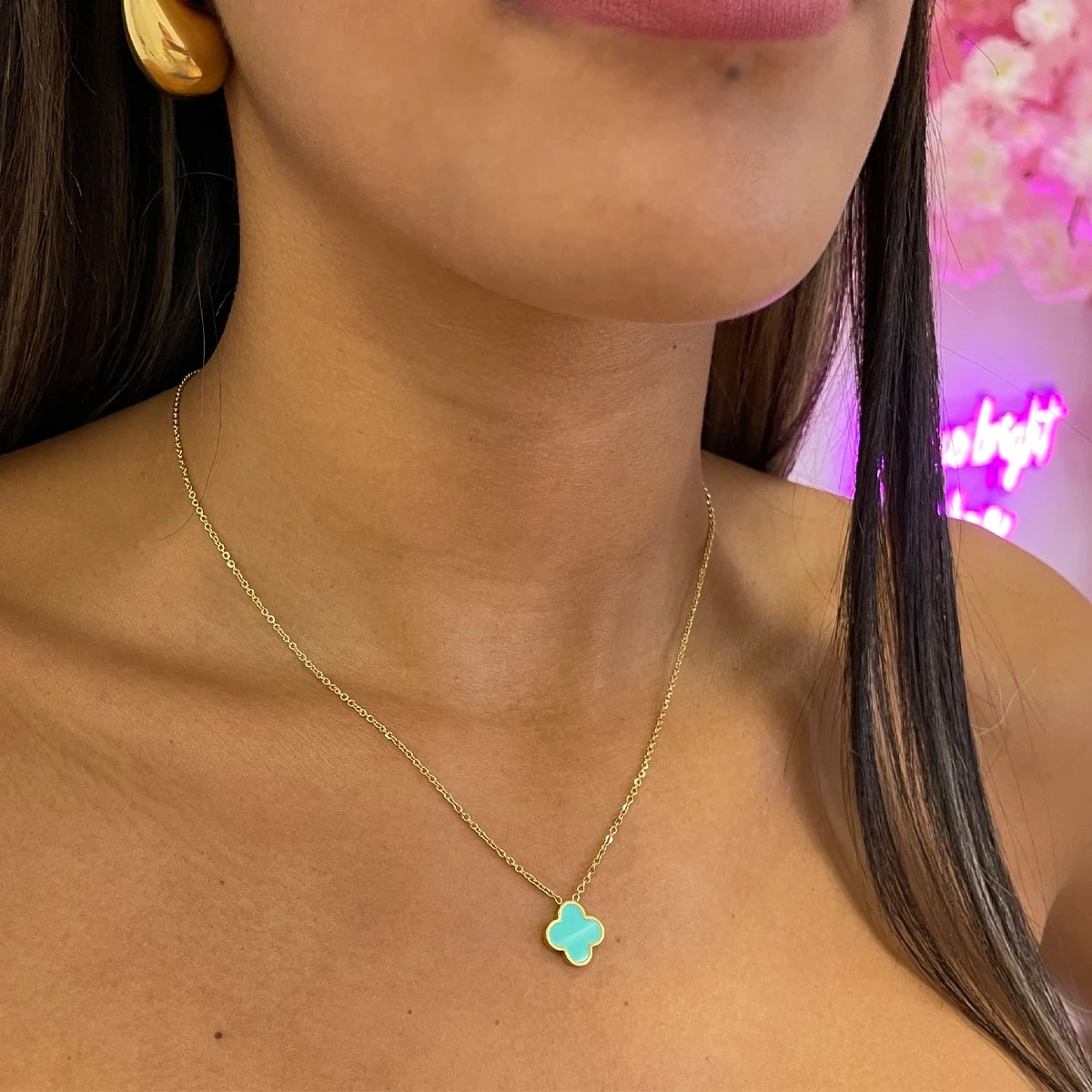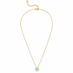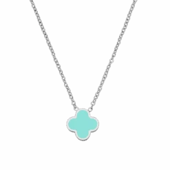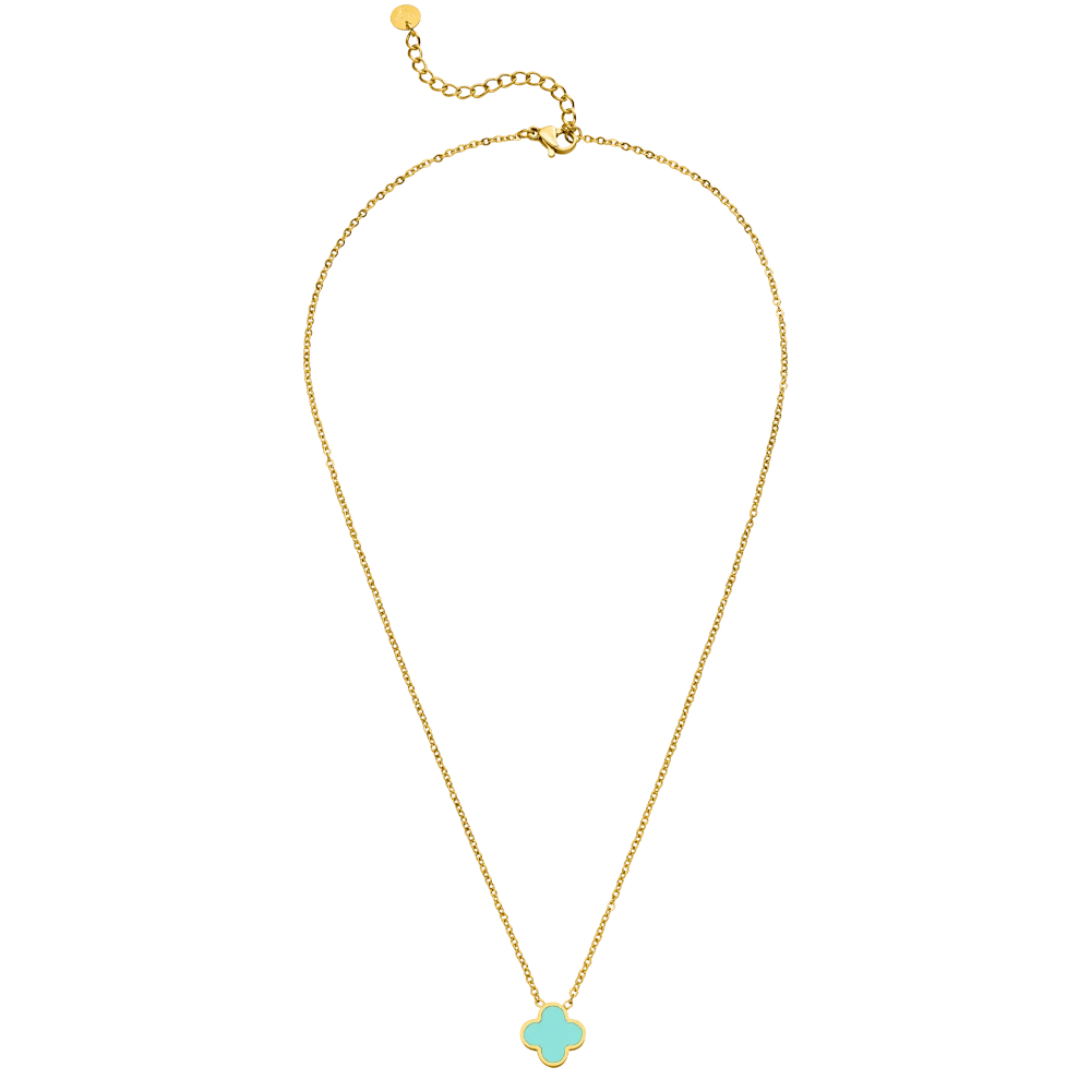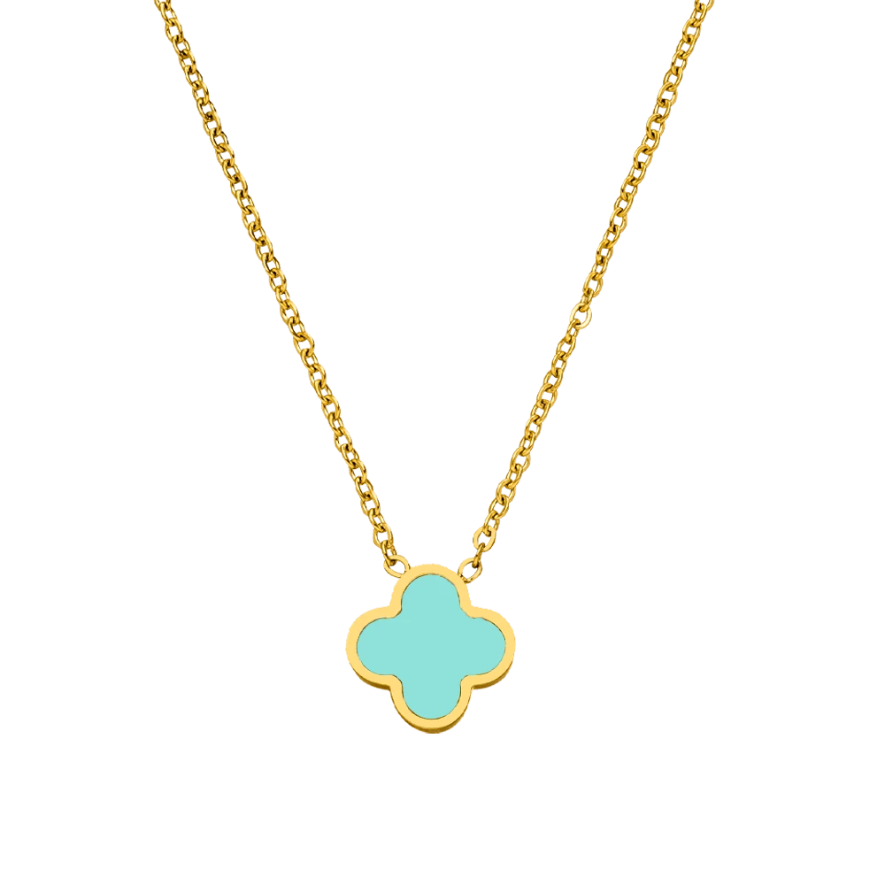 Unsere Ice Blue Clover Halskette ist einseitig mit einem Kleeblättchen in zartem eisblau bestückt. Diese schöne Kleeblättchen Kette für den Alltag, sorgt für ein elegantes Auftreten. Die Oberfläche glänzt dank der 18K Vergoldung bzw. der Hochglanz-Veredelung.