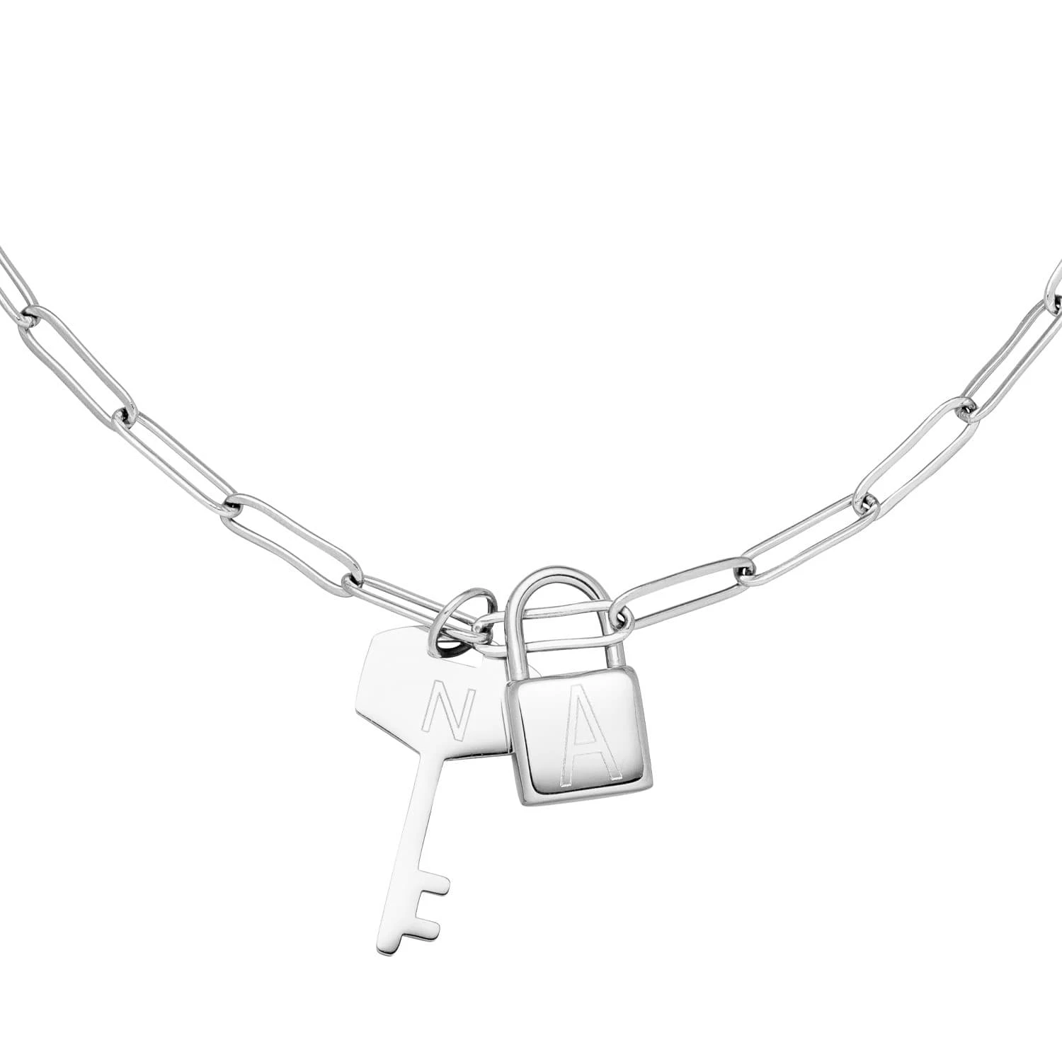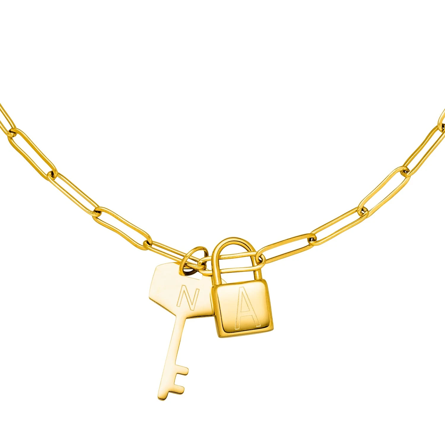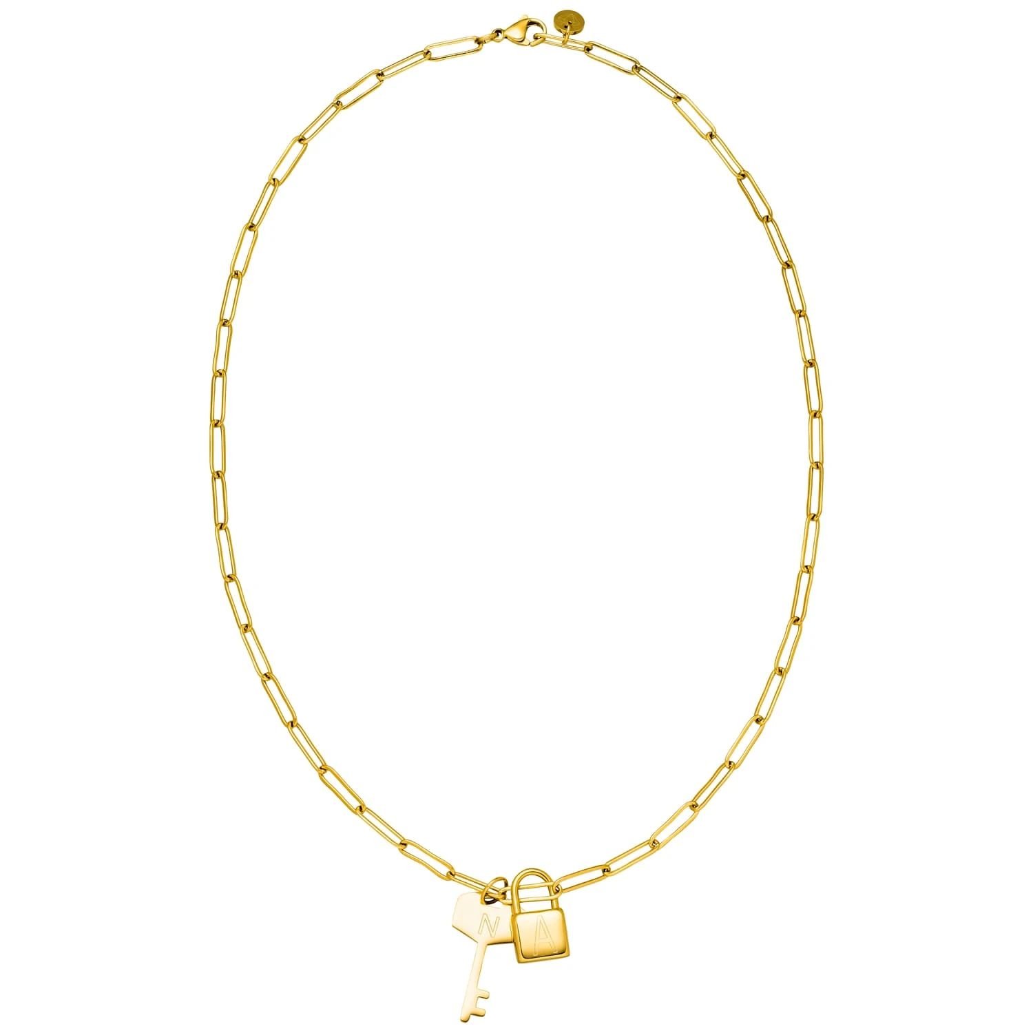 Diese stylische Key Lock Kette inklusive zwei Gravuren (bis zu 5 Zeichen auf dem Schlüssel, bis zu 3 Zeichen auf dem Schloss) ist eine elegante Ergänzung an Deinem Outfit!
