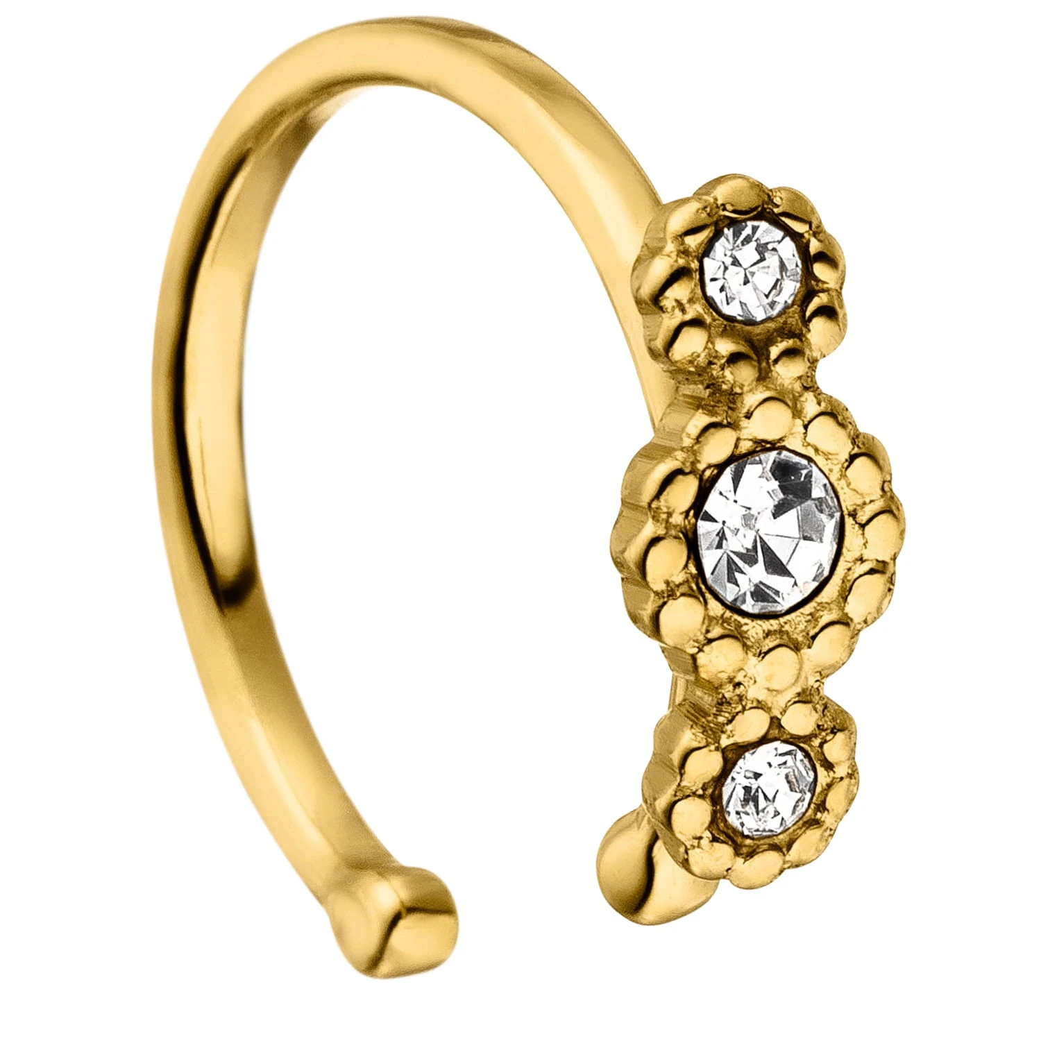 Unser Leyan Ear Cuff mit eingefassten Zirkonia-Steinen funkelt im Sonnenlicht. Er sorgt für ein besonders glanzvollen Auftritt und ist beliebig verstellbar. Werte mit dieser eleganten Ohrklemme Dein Outfit auf!
