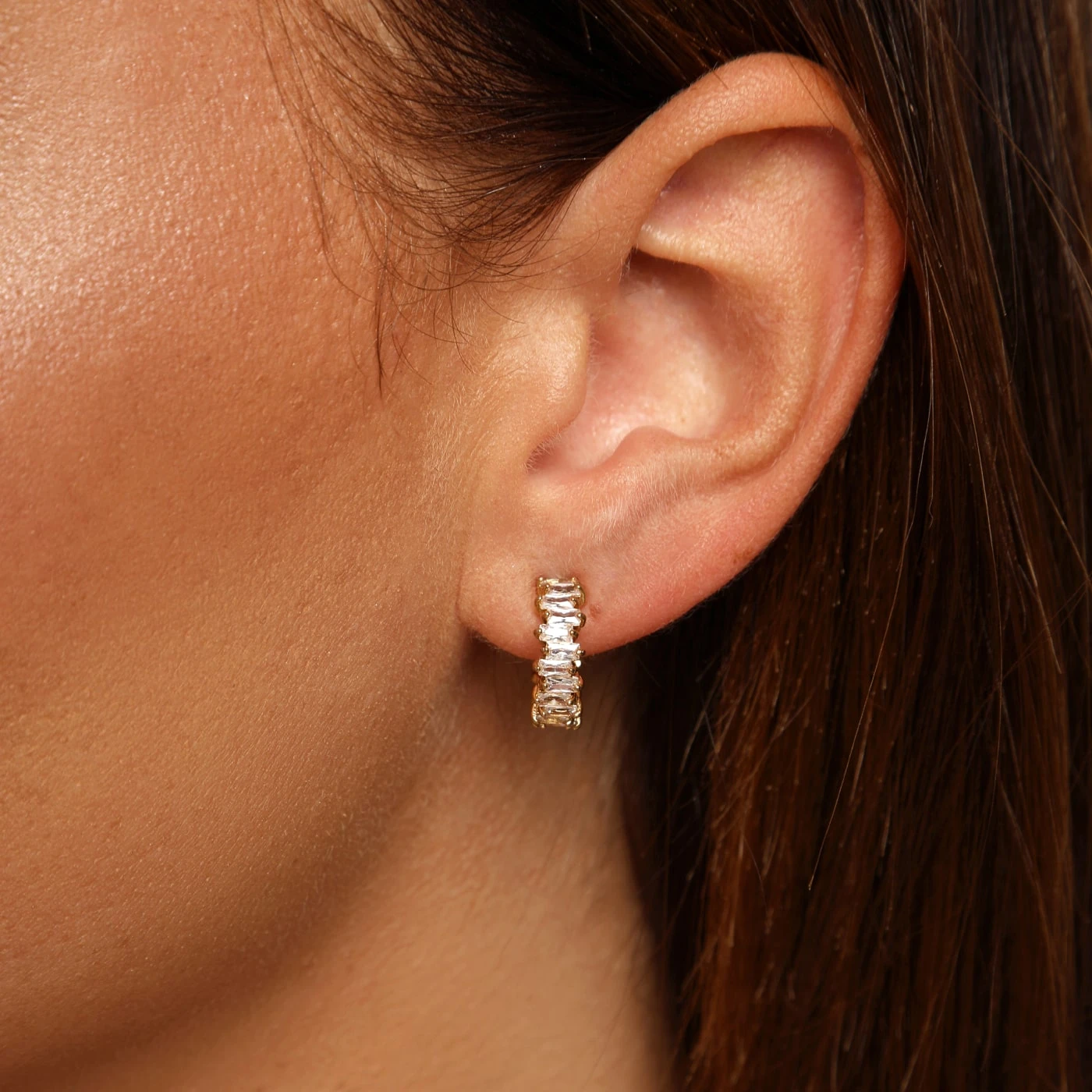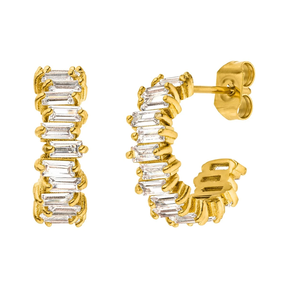 Unsere eleganten Noemi Ohrringe sind mit funkelnden Zirkonia-Steinen im Baguette-Schliff besetzt. Dieser besondere Schliff sorgt dafür, dass das Sonnenlicht besser eingefangen wird und Dich zum Strahlen bringt!