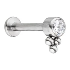 Hochwertiges Titan Piercing mit funkelndem Zirkonia-Stein und drei verzierenden Kügelchen an der Front. Unser Nurit Piercing wird aus medizinischem Titan gefertigt und ist antiallergisch.
