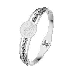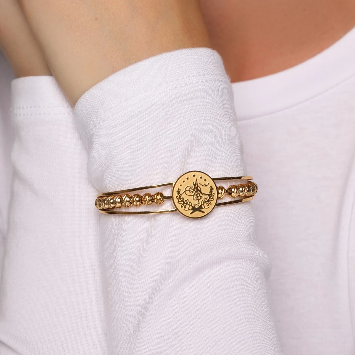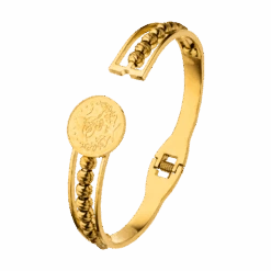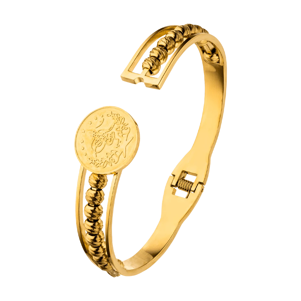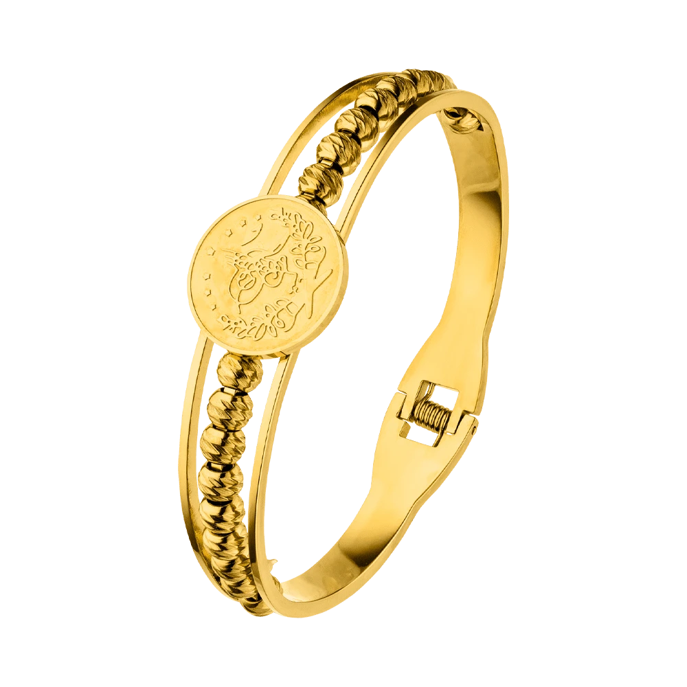 Ein Hauch von Geschichte am Handgelenk: Dieser orientalisch inspirierte Armreif überzeugt mit einem einzigartigen Gravur-Element im Zentrum, das an königliche Siegel und traditionelle Ornamentik erinnert. Die kunstvolle Reliefstruktur verleiht dem Schmuckstück eine tiefe symbolische Ausstrahlung und eine besondere Wertigkeit.