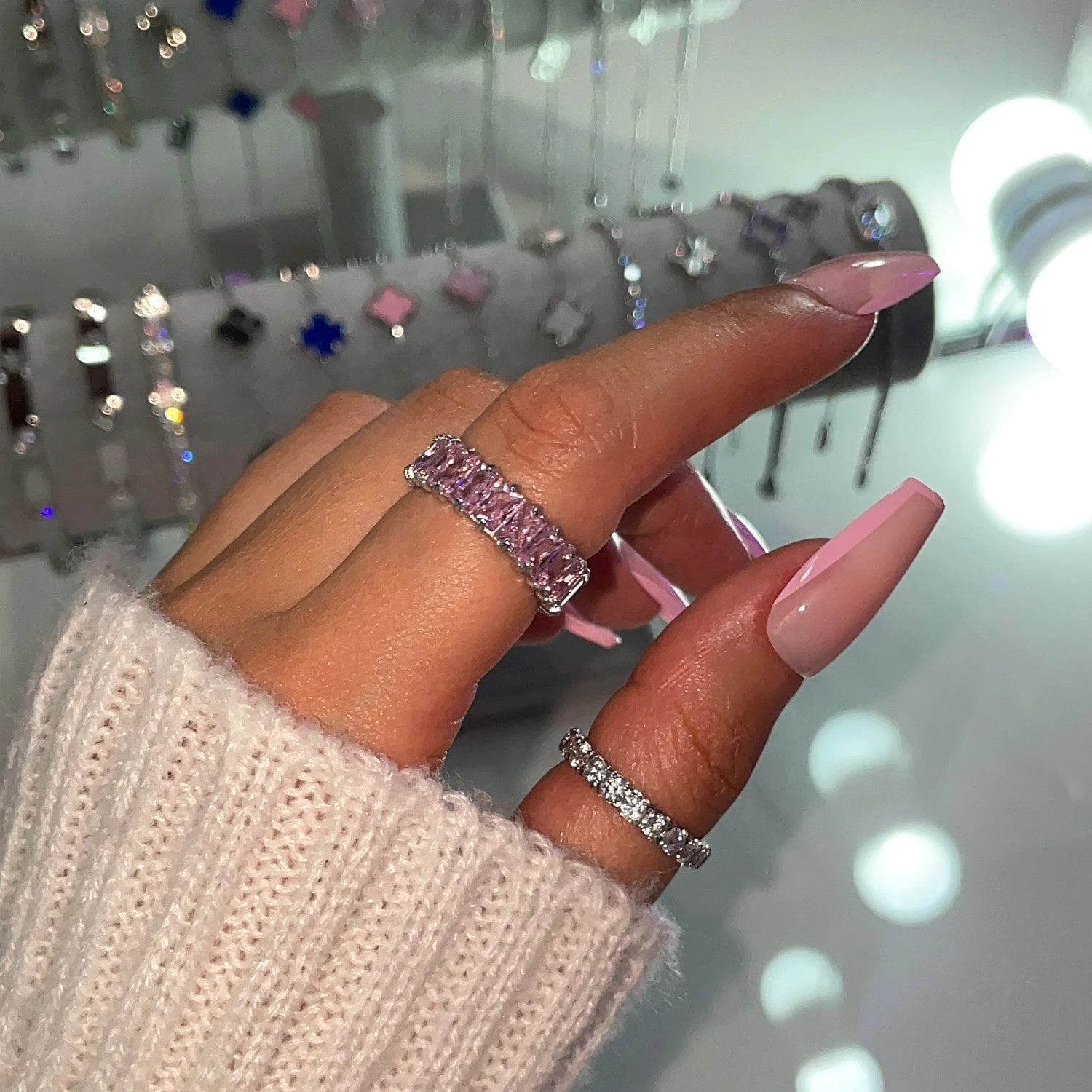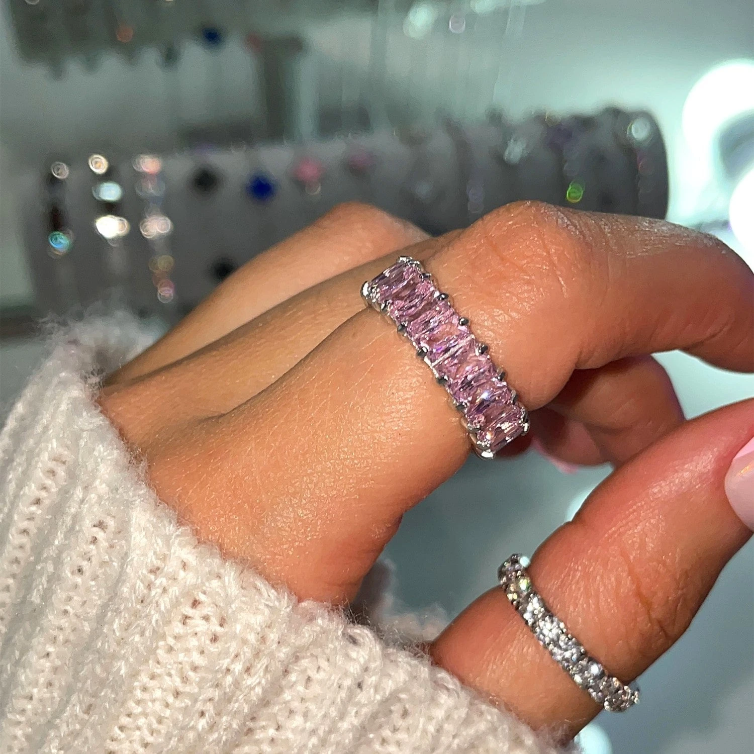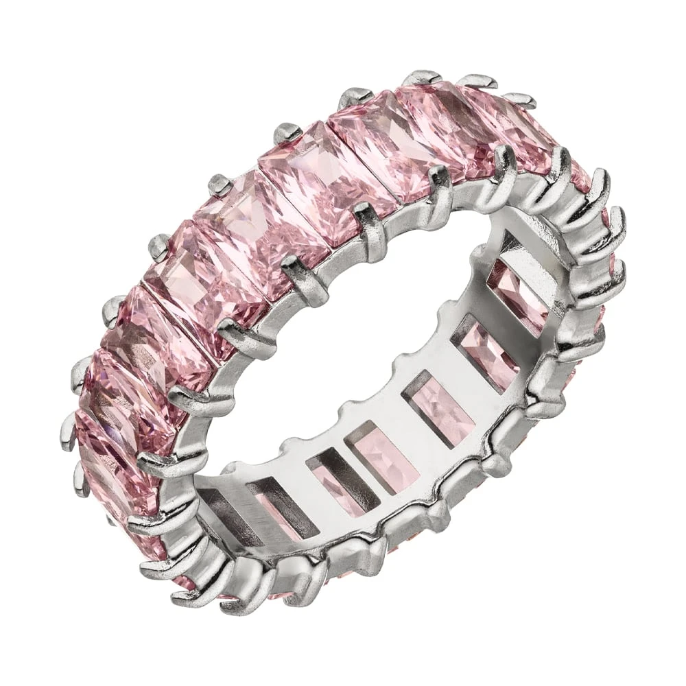 Unser beliebter Raisa Ring, ist mit rosa Zirkonia-Steinen höchster Qualität im Baguette-Schliff besetzt. Dieser wasserfeste Zirkonia Ring fängt dank des besonderen Schliffs, das Sonnenlicht besonders gut ein und lässt Deine Hände erstrahlen!