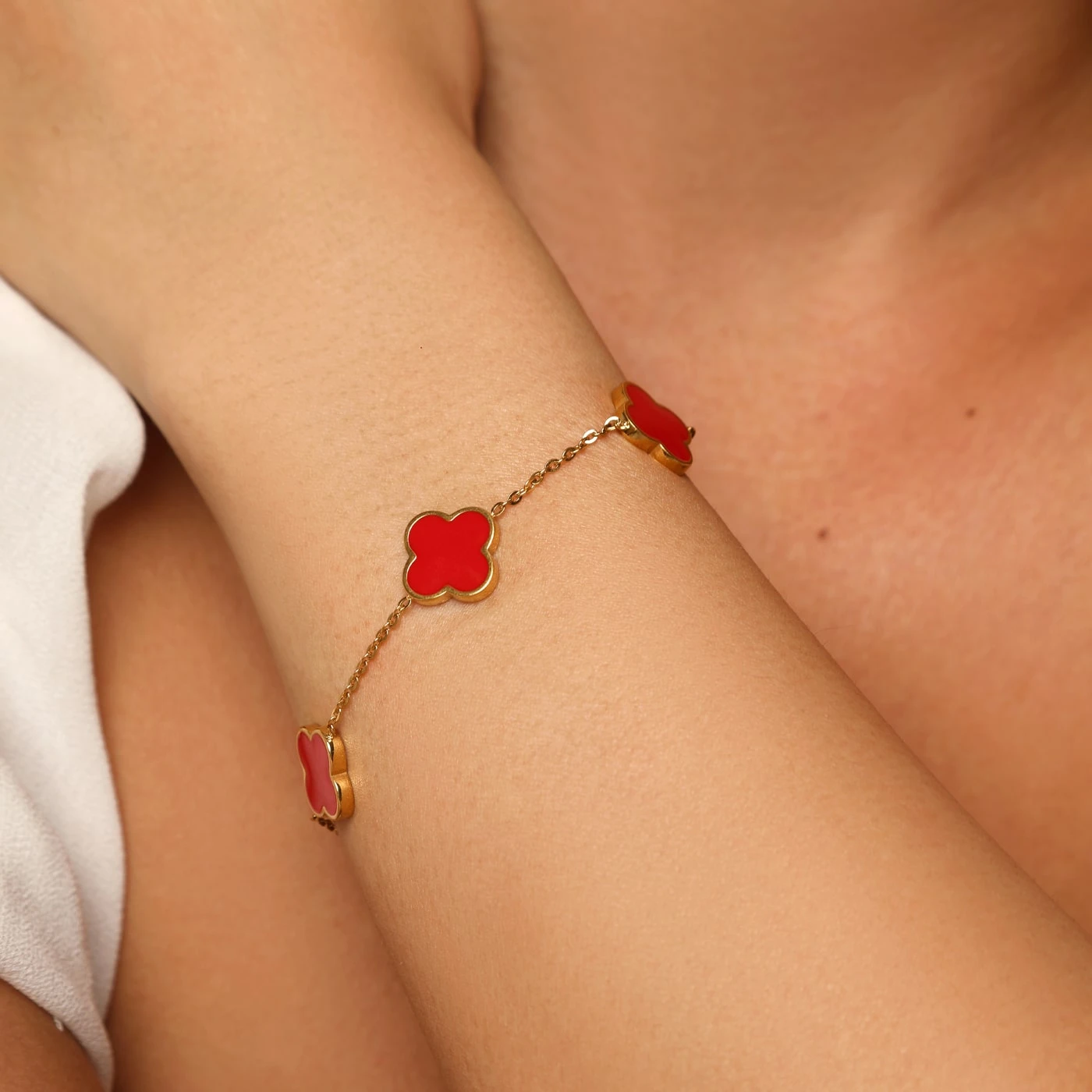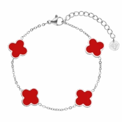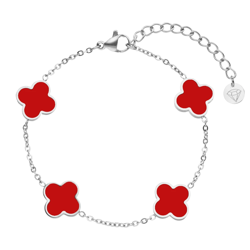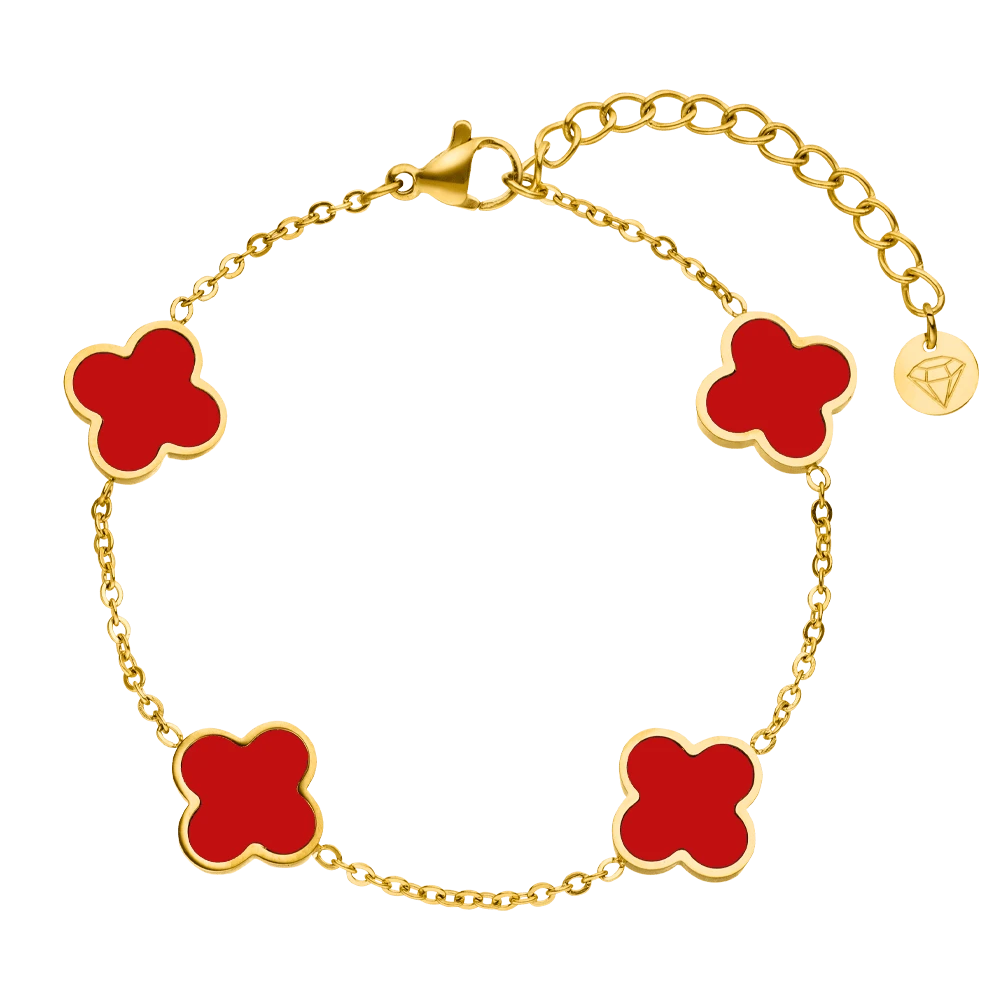 Das Red Clover Armband ist das perfekte Accessoire, um Dein Outfit zu verschönern und einen Hauch von Wärme in Deinen Look zu bringen. Alle vier Kleeblätter symbolisieren mit ihrer roten Farbe die Leidenschaft und Energie, die Deinem Stil einen einzigartigen Ausdruck verleiht. Die eleganten roten Kleeblatt-Details verleihen Deiner Schönheit einen unvergleichlichen Glanz. Durch die besondere Vergoldung und den beständigen Chirurgenstahl ist das Armband wasser- und duschfest.