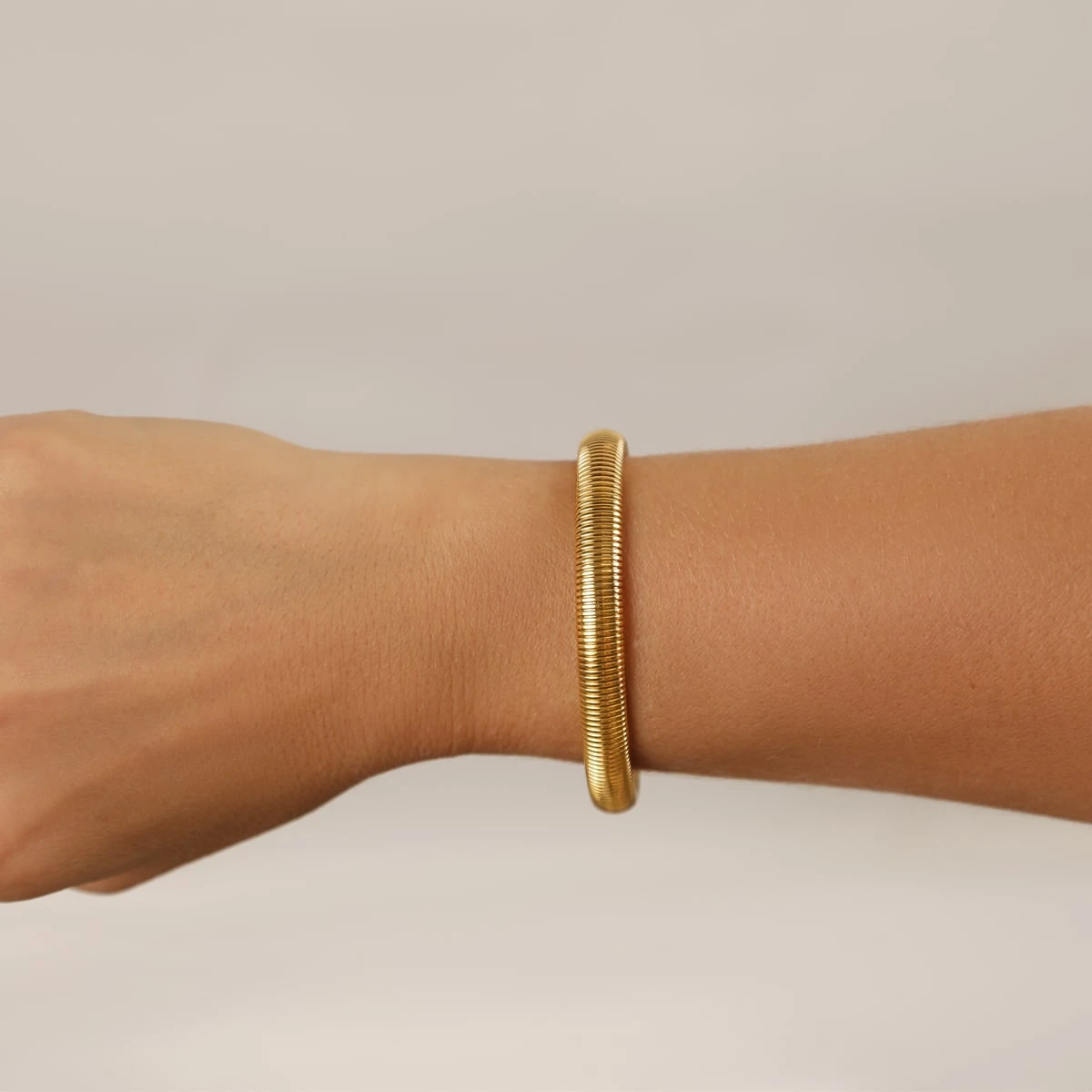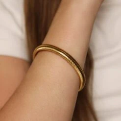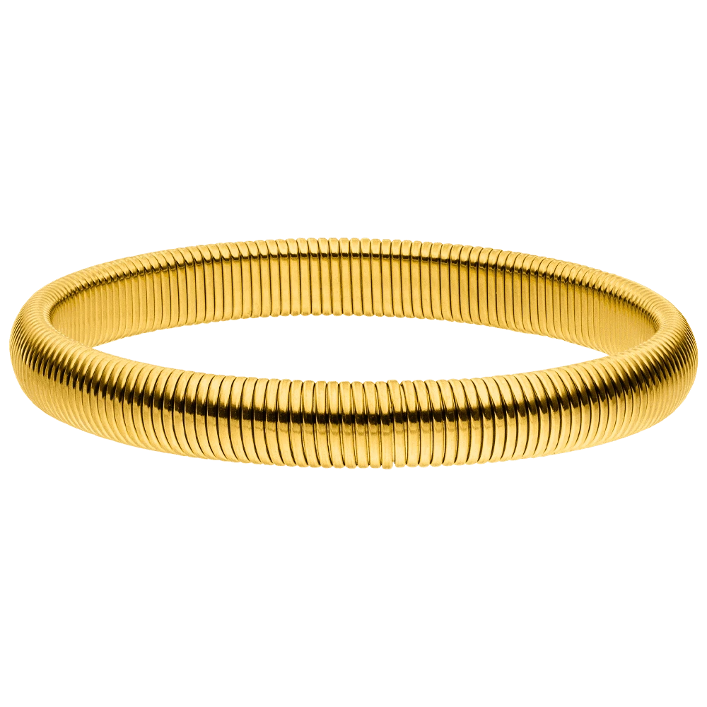 Ein stilvolles Armband aus langlebigem Chirurgenstahl, das sich durch seine Flexibilität mühelos ohne Verschluss anlegen lässt. Die wasserfeste Oberfläche bietet eine Auswahl zwischen edler 18K Gelbgold-Vergoldung, 18K Roségold-Vergoldung oder einem eleganten Hochglanz-Finish. Perfekt für jeden Anlass, verbindet es Tragekomfort mit hochwertigem Design.