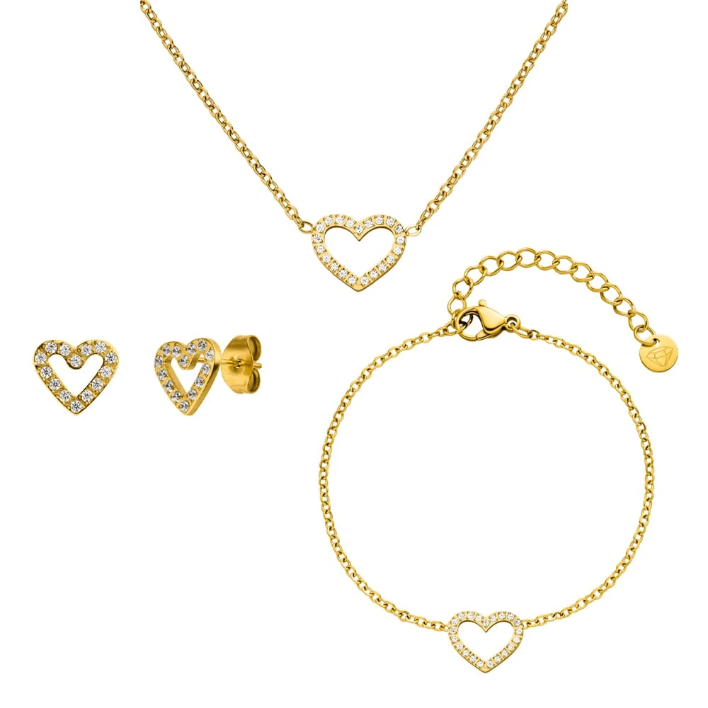 Dieses Schmuckset aus hochwertigem Edelstahl in strahlendem Gold oder Silber vereint zarte Eleganz mit zeitloser Symbolik. Die filigrane Herzform, besetzt mit funkelnden Zirkoniasteinen, findet sich in Kette, Armband und Ohrsteckern wieder – perfekt aufeinander abgestimmt. Dank der wasserfesten Vergoldung bleibt der Glanz dauerhaft erhalten. Ein liebevolles Set für besondere Anlässe oder als täglicher Begleiter mit Bedeutung.