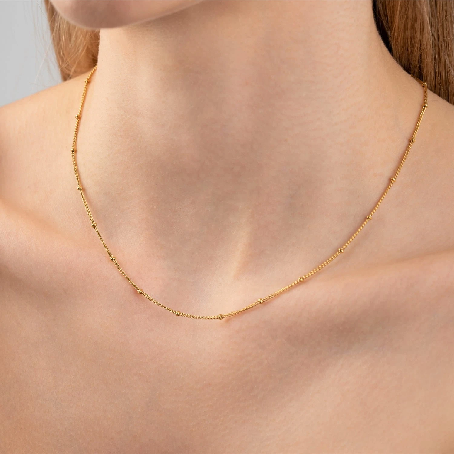 Filigrane Halskette aus wasser- und duschfestem Edelstahl in dezentem Stil. Die Simple Kette ist mit feinen KĂĽgelchen rundum bestĂĽckt.