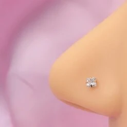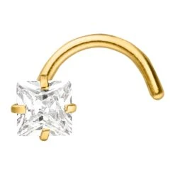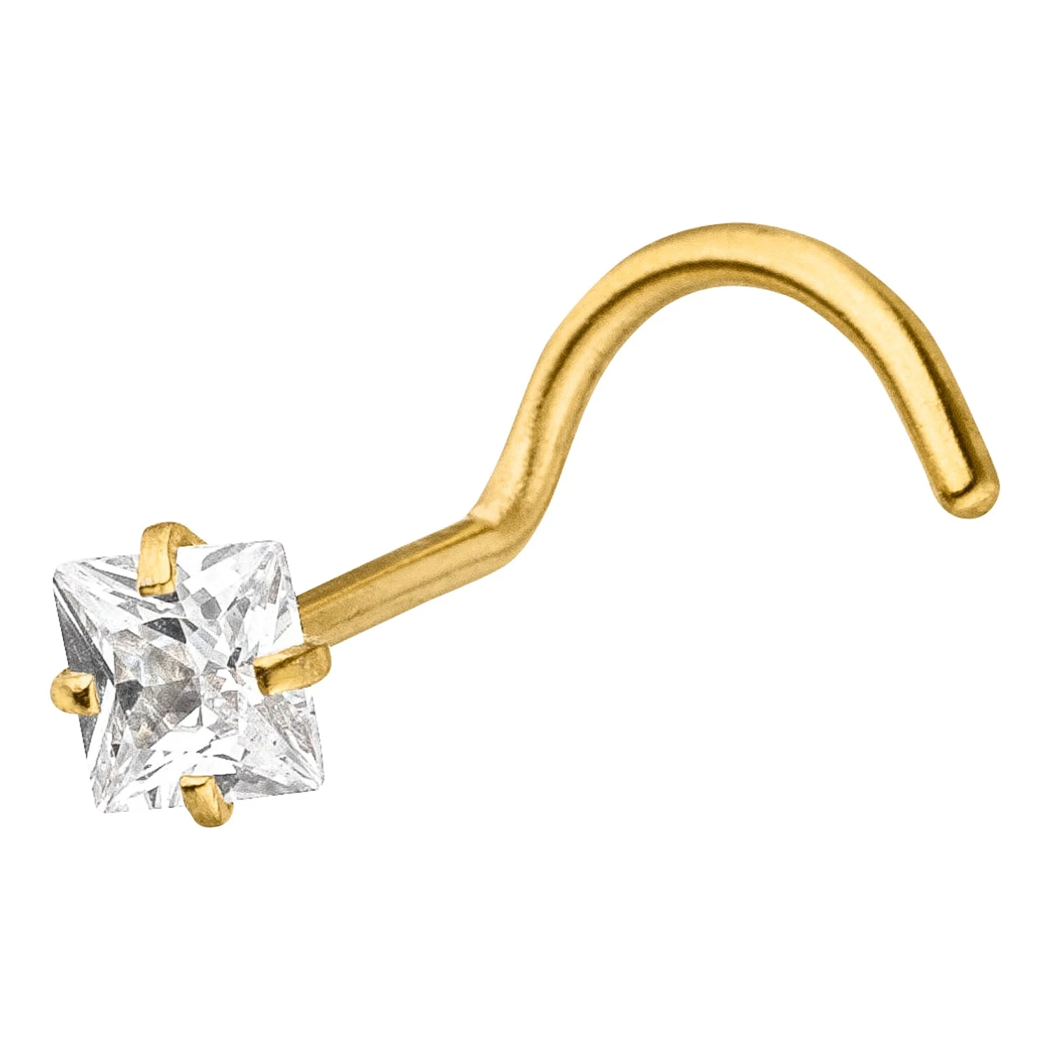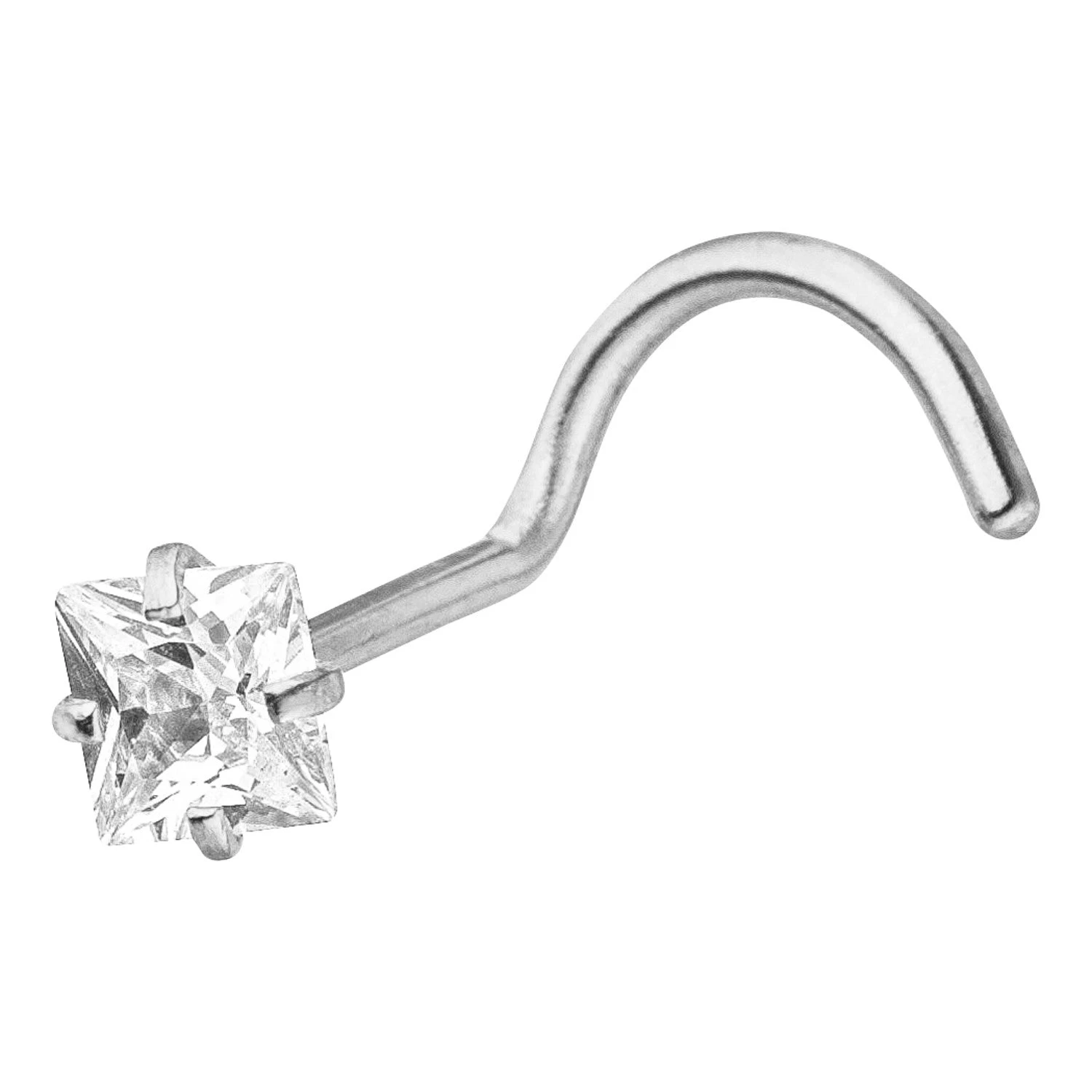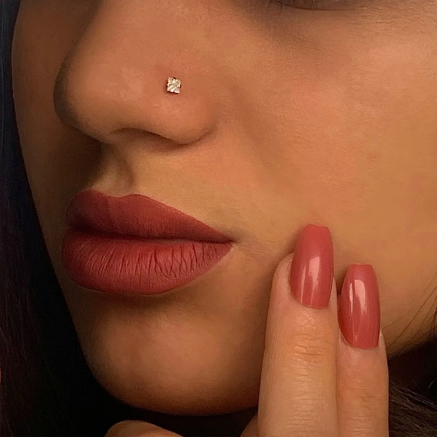 Die Front des Nasenpiercings ist mit einem strahlenden, quadratischen Zirkonia-Stein bestückt.