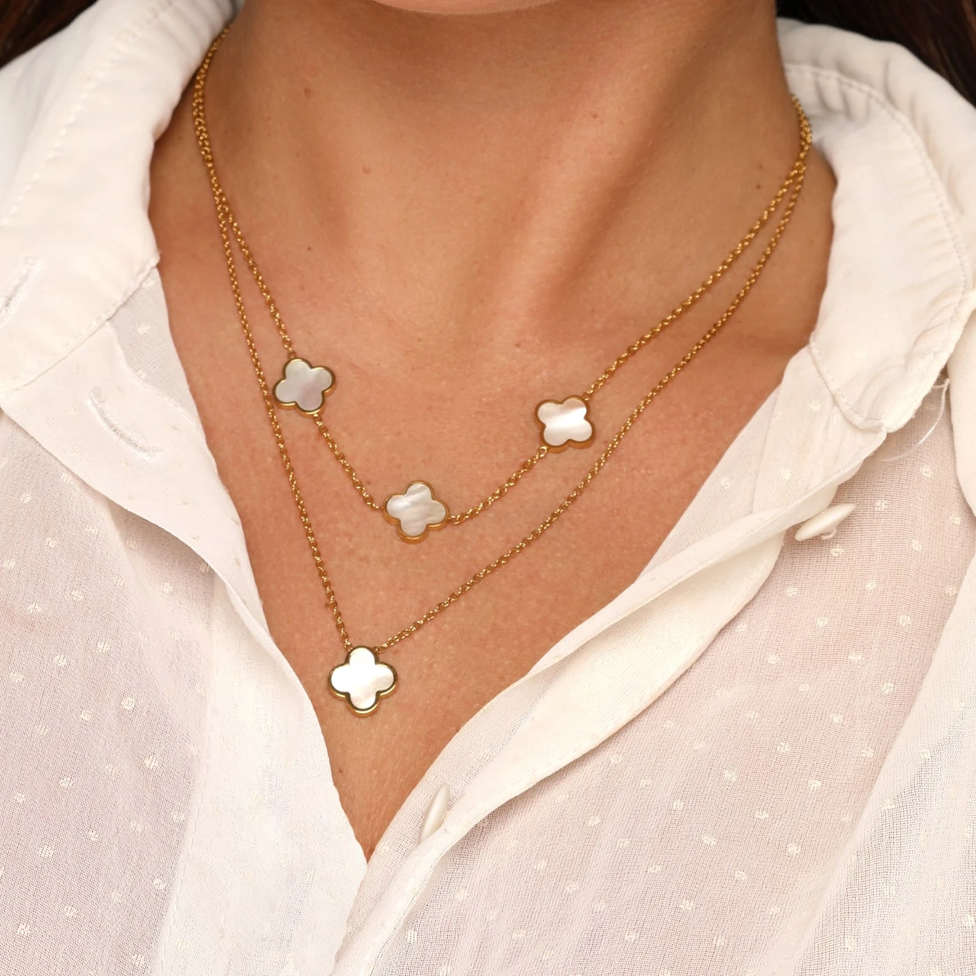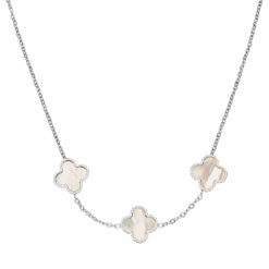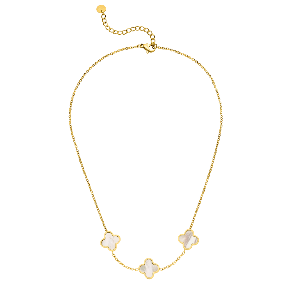 Filigrane Halskette mit drei Kleeblatt-Anhängern einseitig gefüllt mit Perlmutt. Diese schöne Kleeblatt Kette strahlt im Sonnenlicht durch das Perlmutt in einzigartigen Farben. Dank des beständigen Chirurgenstahl und der hochwertigen Vergoldung, ist die Three Clovers Halskette wasser- und duschfest.