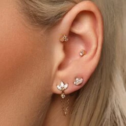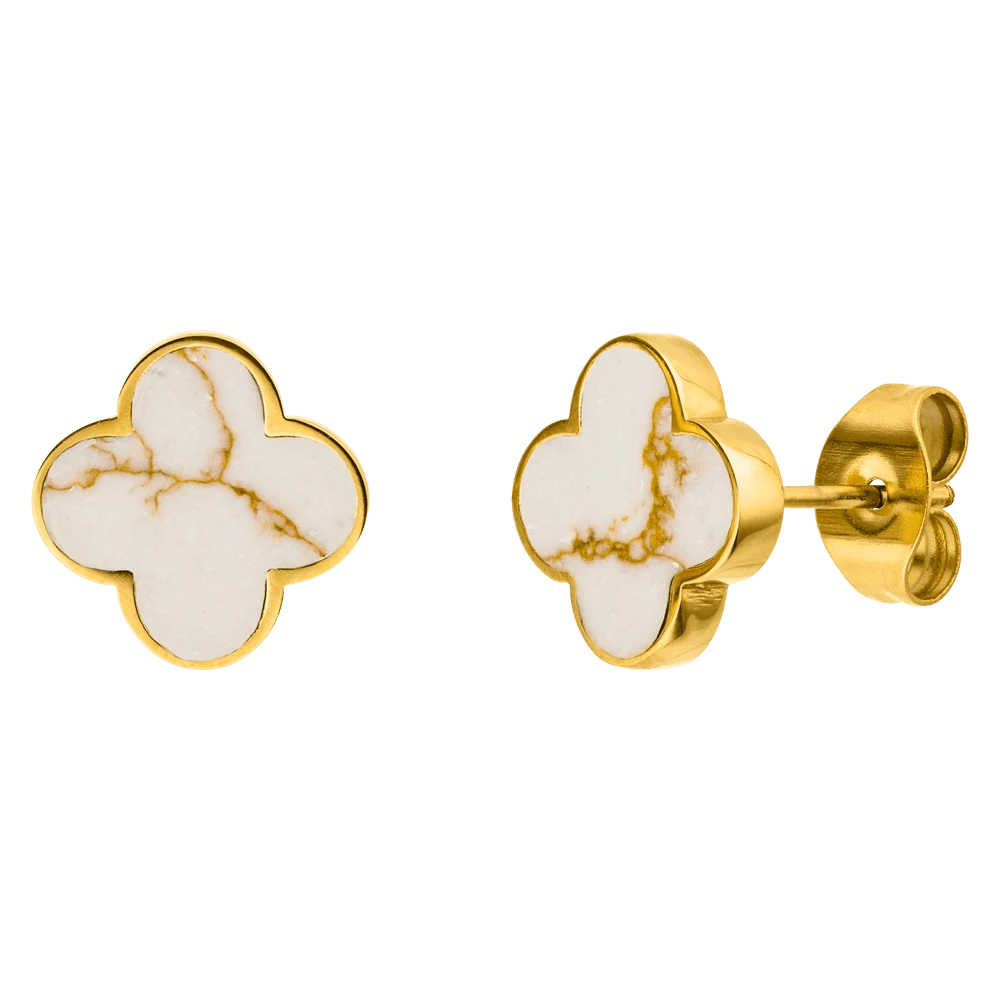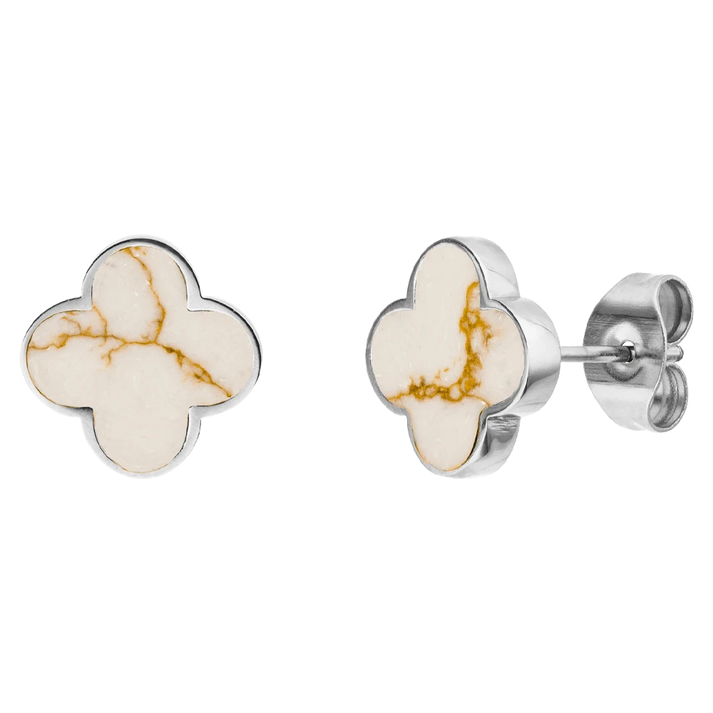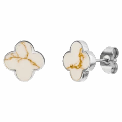 Unsere eleganten White-Gold Clover Ohrstecker eignen sich aufgrund ihrer dezenten & stilvollen Optik ideal für den Business-Look und im Alltag. Die Kleeblätter sind aus einem Naturstein hergestellt. Jedes Schmuckstück ist ein Unikat.