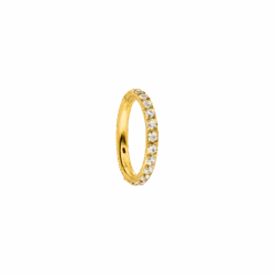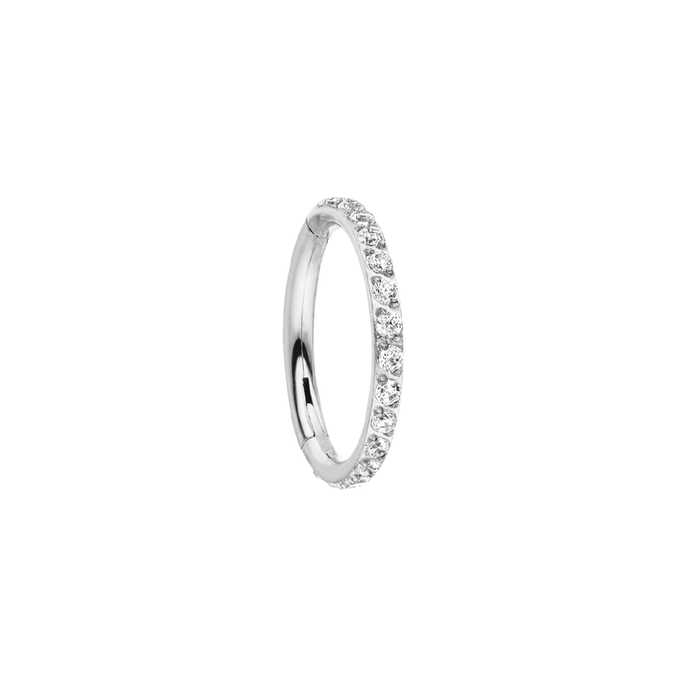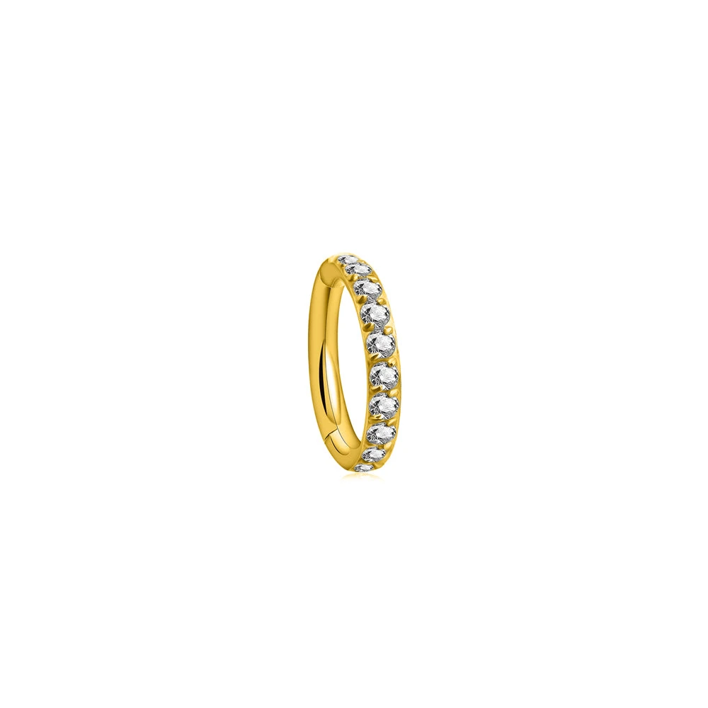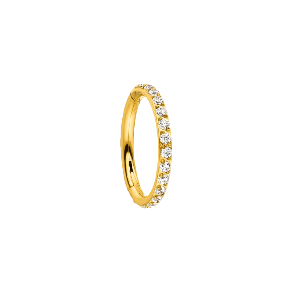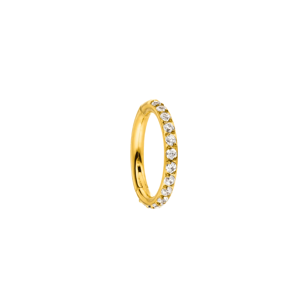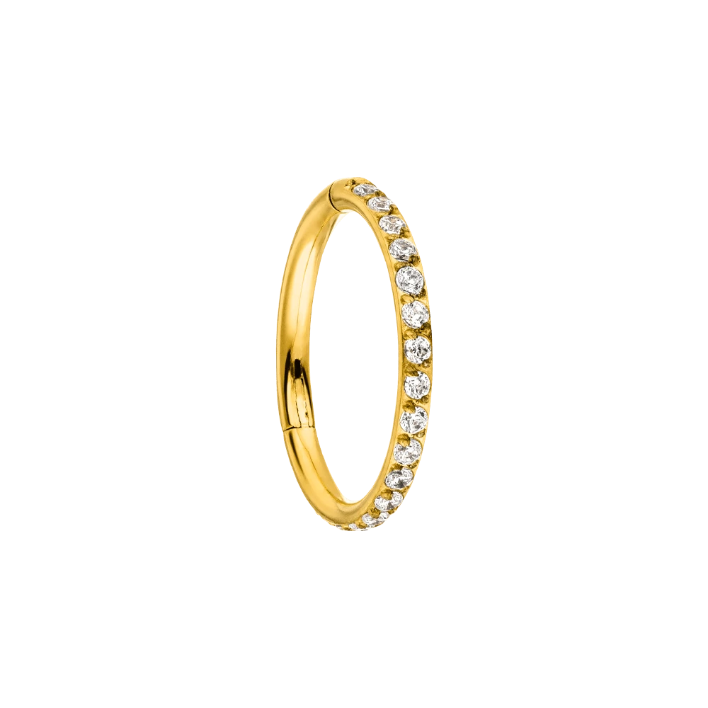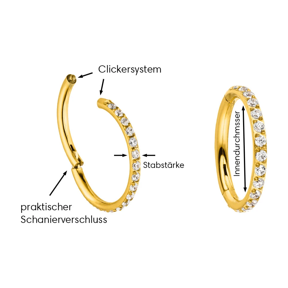 Hochwertiger Segmentring mit Clickerverschluss. Mit seinen funkelnden Zirkonia-Steinen sorgt unser Zircon Clicker für einen glänzenden Auftritt. Dank des Titans und der speziellen 18 Karat Vergoldung, ist das Piercing wasserfest.