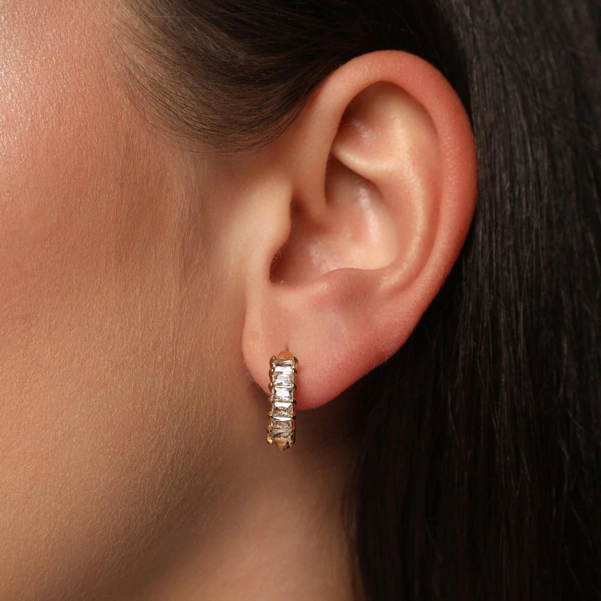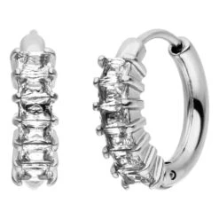 Diese eleganten Hoop-Ohrringe überzeugen durch ihre klare Linienführung und funkelnde Zirkonia im Baguette-Schliff. Die Steine sind präzise eingefasst und verleihen dem Design einen luxuriösen Look. Gefertigt aus hochwertigem, wasserfestem Chirurgenstahl – wahlweise in Silber oder Gold – sind sie ideal für den Alltag und besondere Anlässe. Ein Must-have für alle, die minimalistischen Glamour lieben.